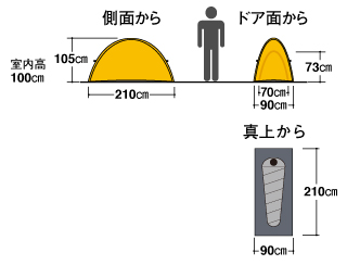 【構成】テント本体1、本体ポール2本、∅3mm反射材入り張り綱4本、16cmアルミVペグ8本、ポール応急補修用パイプ1本、スタッフバッグ(本体用1、ポール用1、ペグ用1)