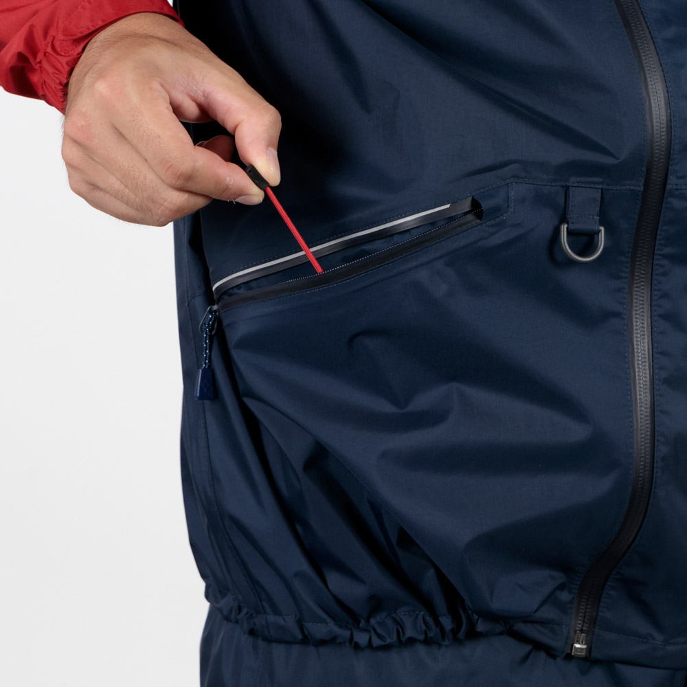 本製品は縫い目を目止め(シームテープ)処理することで身体側に水が浸入しないように設計されていますが、構造上ポケットの内部は浸水する恐れがあります。貴重品等は防水ケースに入れるなどして防水対策をしてください。