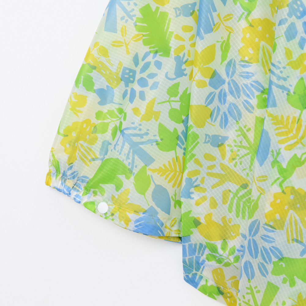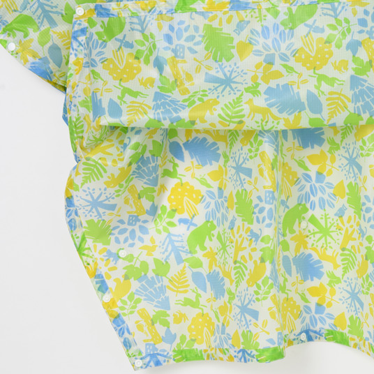 デイパックやランドセルごとすっぽりとかぶることができるプリント柄デザインのポンチョです。独自の高耐水圧素材ハイドロプロ® 2レイヤーを使用。成長に合わせたフィッティングを行えるよう、すそ部分には丈の長さを調節できるホックを設けています。ホックとゴムで袖口を作り手が隠れない仕様や背面に反射テープを配するなど、操作性や安全面に配慮した機能が充実。軽量・コンパクトに収納できるので、ハイキングや通学への携行にも大変便利です。