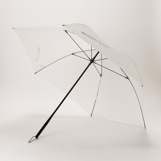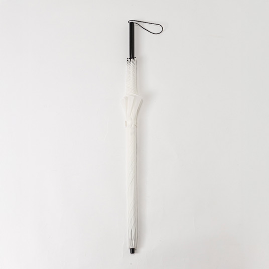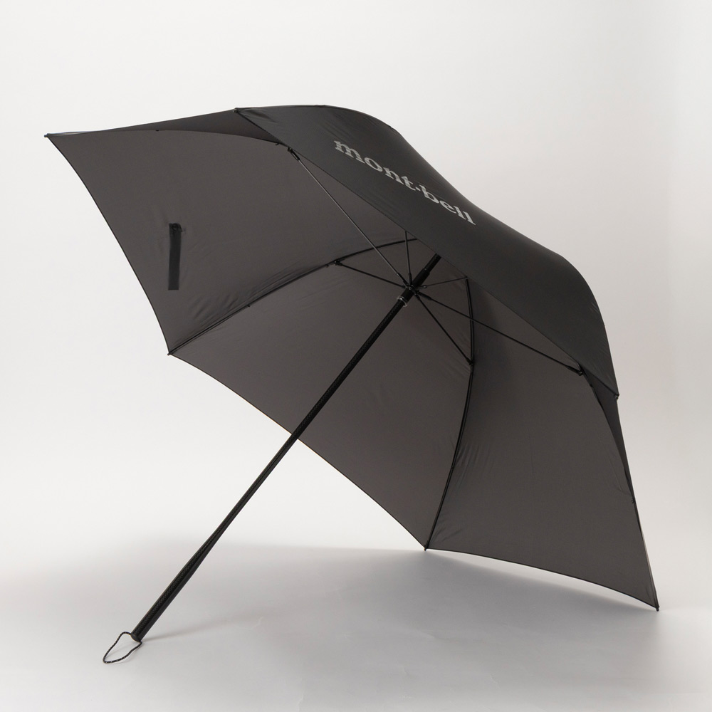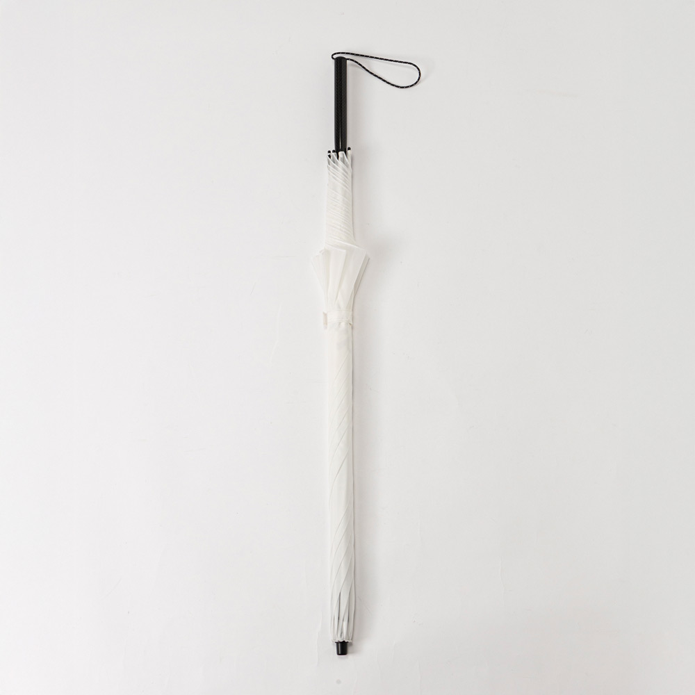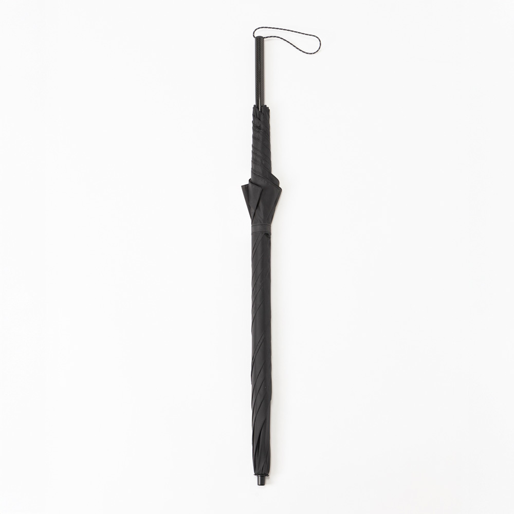 傘骨が全てカーボン素材の超軽量・長傘です。開閉しやすく、折り畳まずに収納できます。骨長60cm、6本骨。収納時、バックパックの側面に収まるサイズです。持ち手は中棒と一体成形されており、握りやすい形状です。