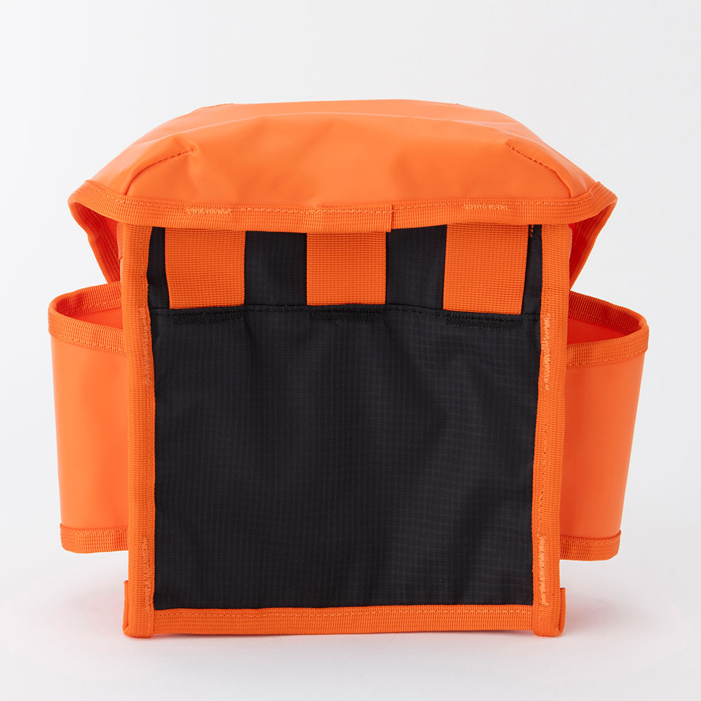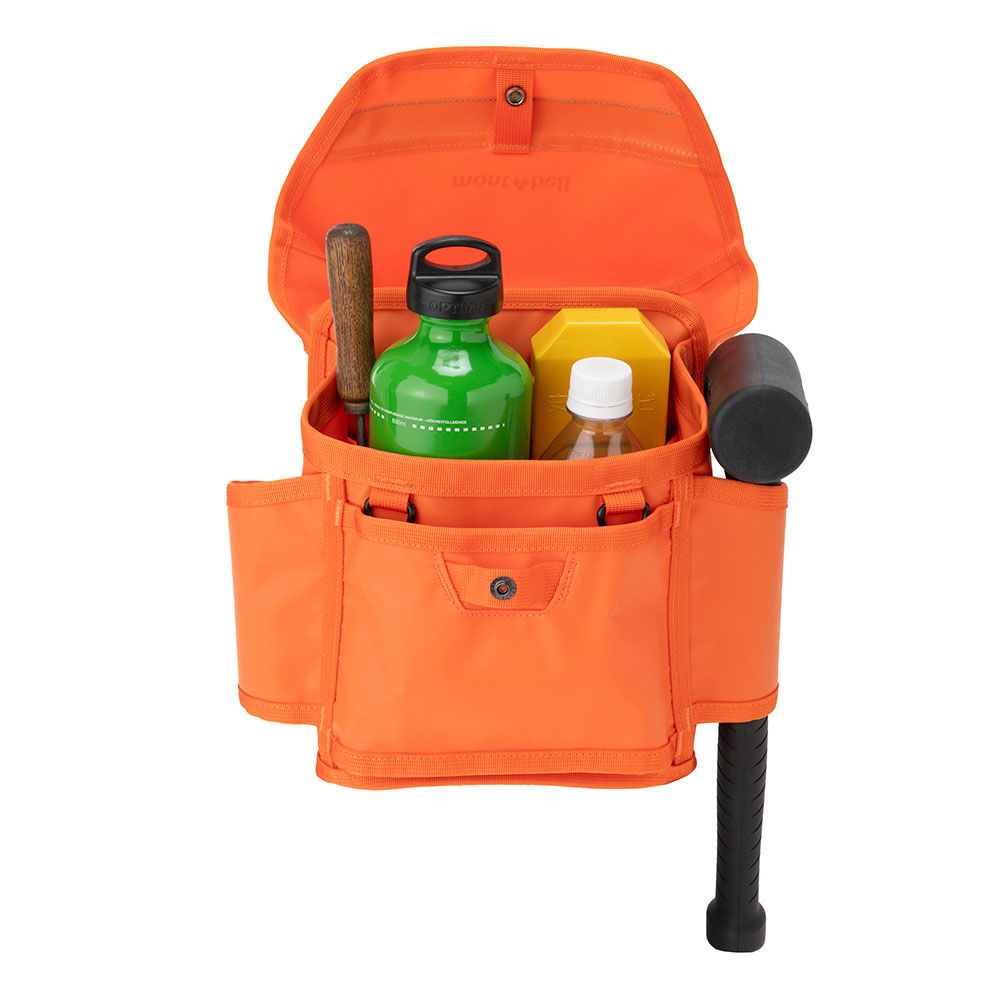 「ロガー ツールベルト」に装着できるフラップ付きのツールバッグです。フラップがあることで木屑や泥が入るのを防ぎます。林業用の作業道具や燃料ボトル、チェーンソーのメンテナンス用品などを効率的に収納できるポケットを装備。耐久性・耐油性に優れた素材を使用し、強度もあり型崩れしにくくなっています。反射材を配しており視認性に優れています。両サイドのスリーブは手斧やハンマーなどの装着に便利です。フラップは着脱できます。テープ幅が50mm以下のベルトにも装着可能です。