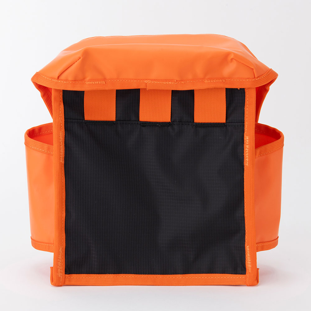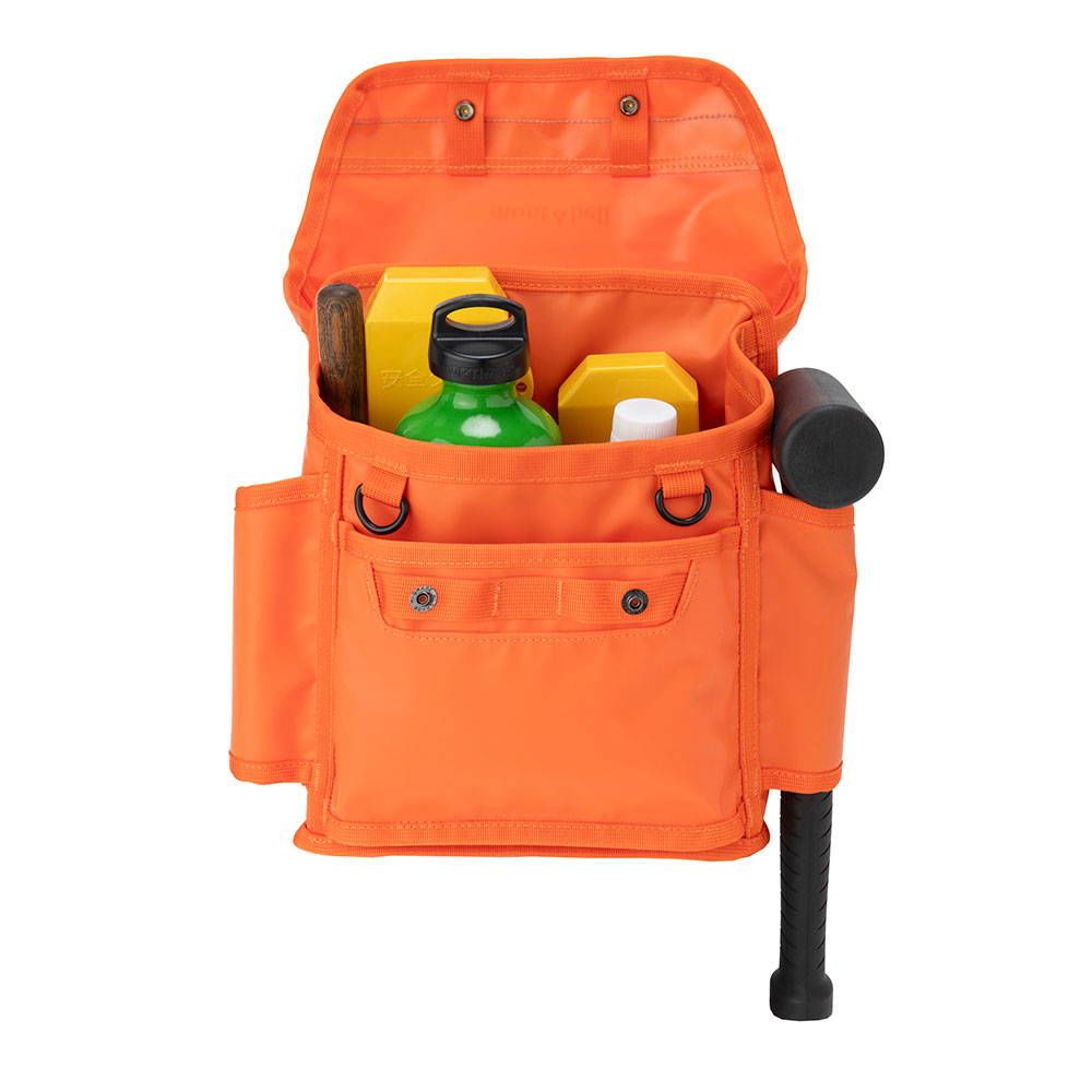 「ロガー ツールベルト」に装着できるフラップ付きのツールバッグです。フラップがあることで木屑や泥が入るのを防ぎます。林業用の作業道具や燃料ボトル、チェーンソーのメンテナンス用品などを効率的に収納できるポケットを装備。耐久性・耐油性に優れた素材を使用し、強度もあり型崩れしにくくなっています。反射材を配しており視認性に優れています。両サイドのスリーブは手斧やハンマーなどの装着に便利です。フラップは着脱できます。テープ幅が50mm以下のベルトにも装着可能です。