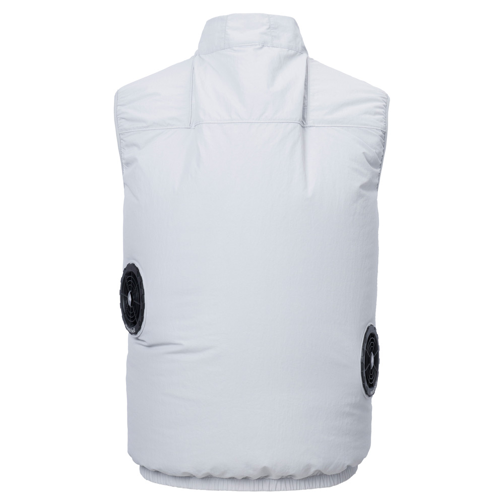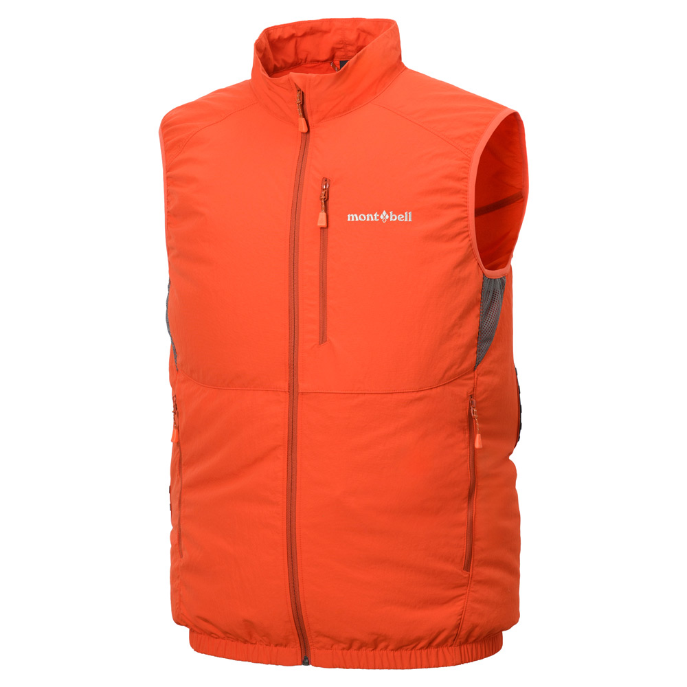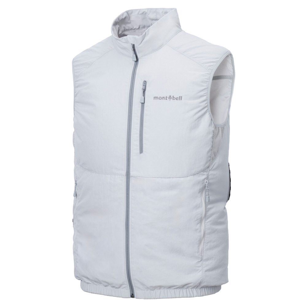 暑い時季のアクティビティなどで活躍する専用のファンとバッテリーが取り付けられるベストです。ファンから取り込まれた空気が襟の後ろと脇から効率よく通り抜ける構造で、汗の気化を促進し、快適に過ごすことができます。左右非対称に取り付けられるファン(#1132244)は小型バックパックを背負った際にショルダーベルトと干渉しにくい位置にあります。ファンを使用しないときには取り付け穴にベルクロで装着できるカバーが付属し、ウインドシェルとしても使用できます。