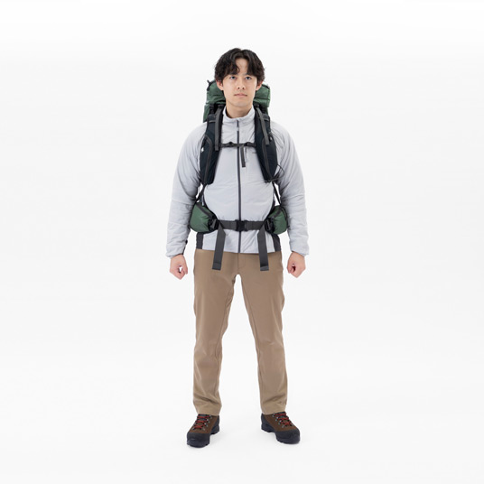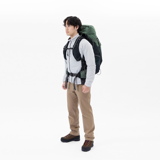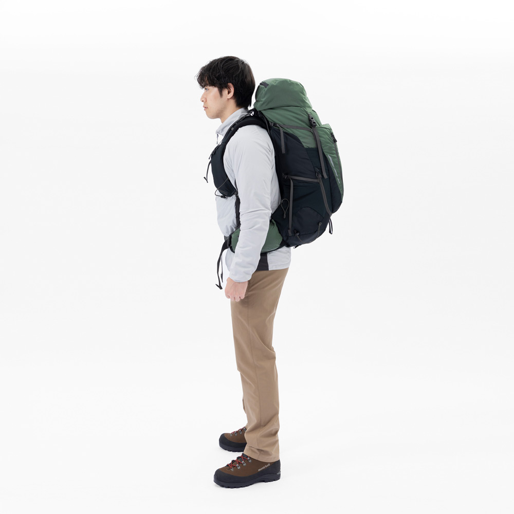 大小さまざまなポケットや本体下部へのアクセスジッパーを装備し、収納力に優れる中型パックです。ショルダーハーネスの取付位置を変えることで背面寸法を調節し、体格に合わせて簡単にフィッティングすることが可能です。1泊2日程度の小屋泊まり登山に適した容量です。専用パックカバー付き。
