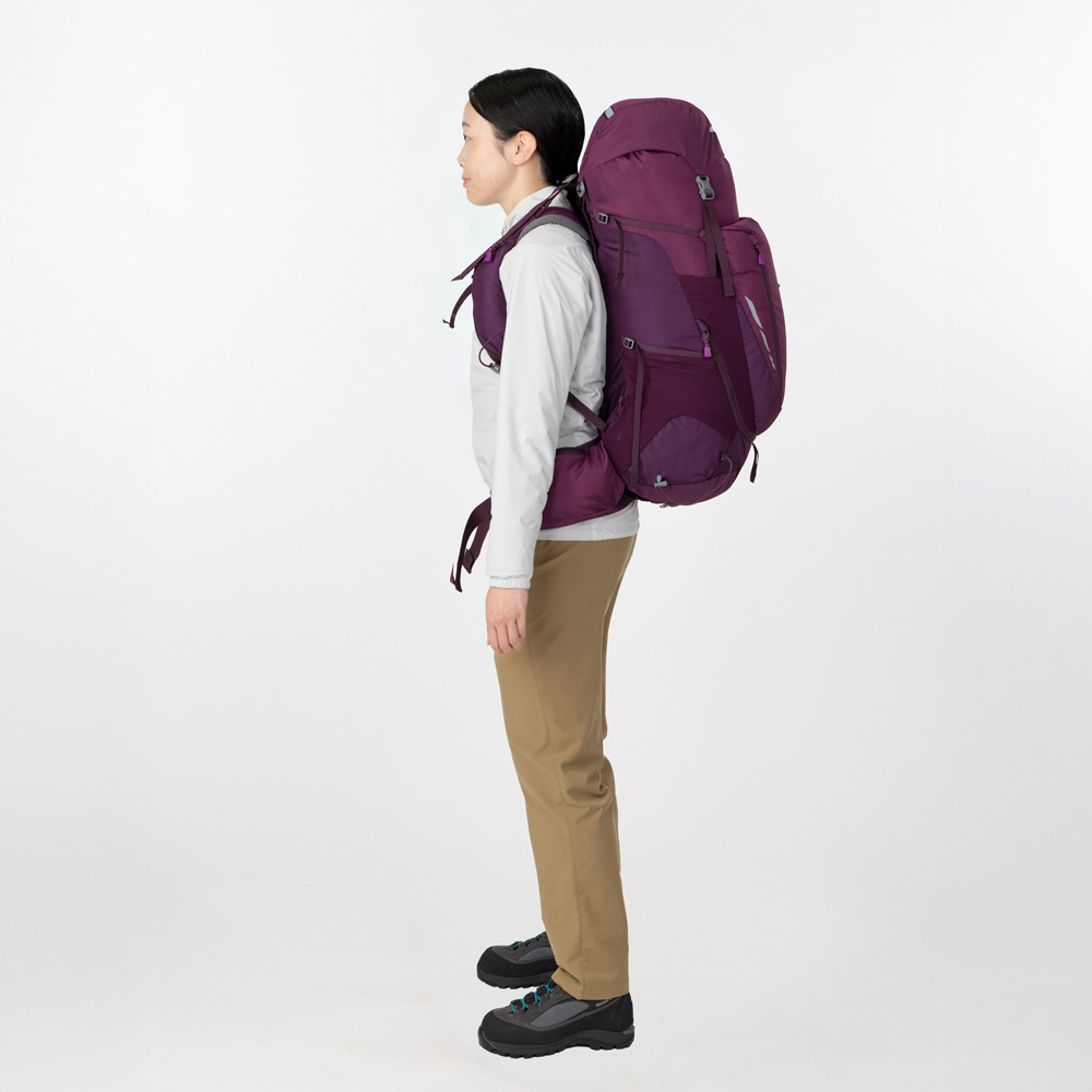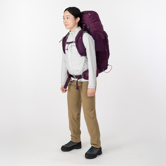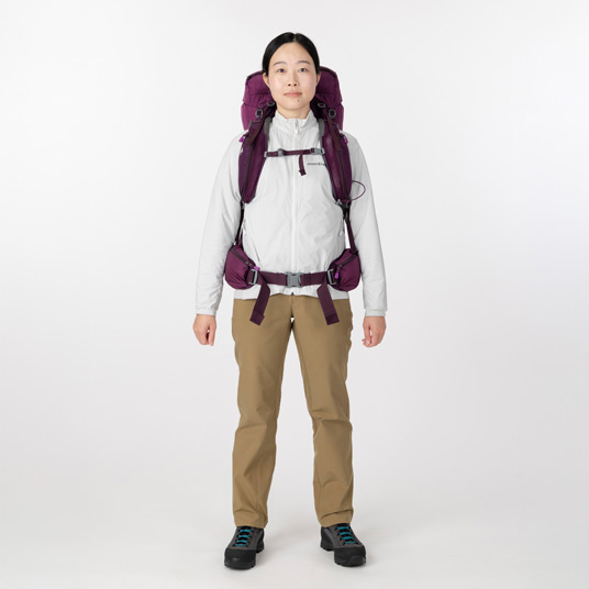 大小さまざまなポケットや本体下部へのアクセスジッパーを装備し、収納力に優れる中型パックの女性用モデルです。ショルダーハーネスの取付位置を変えることで背面寸法を調節し、体格に合わせて簡単にフィッティングすることが可能です。1泊2日程度の小屋泊まり登山に適した容量です。専用パックカバー付き。