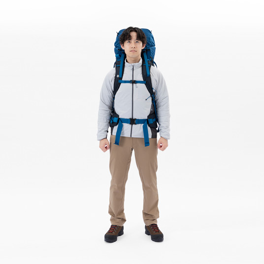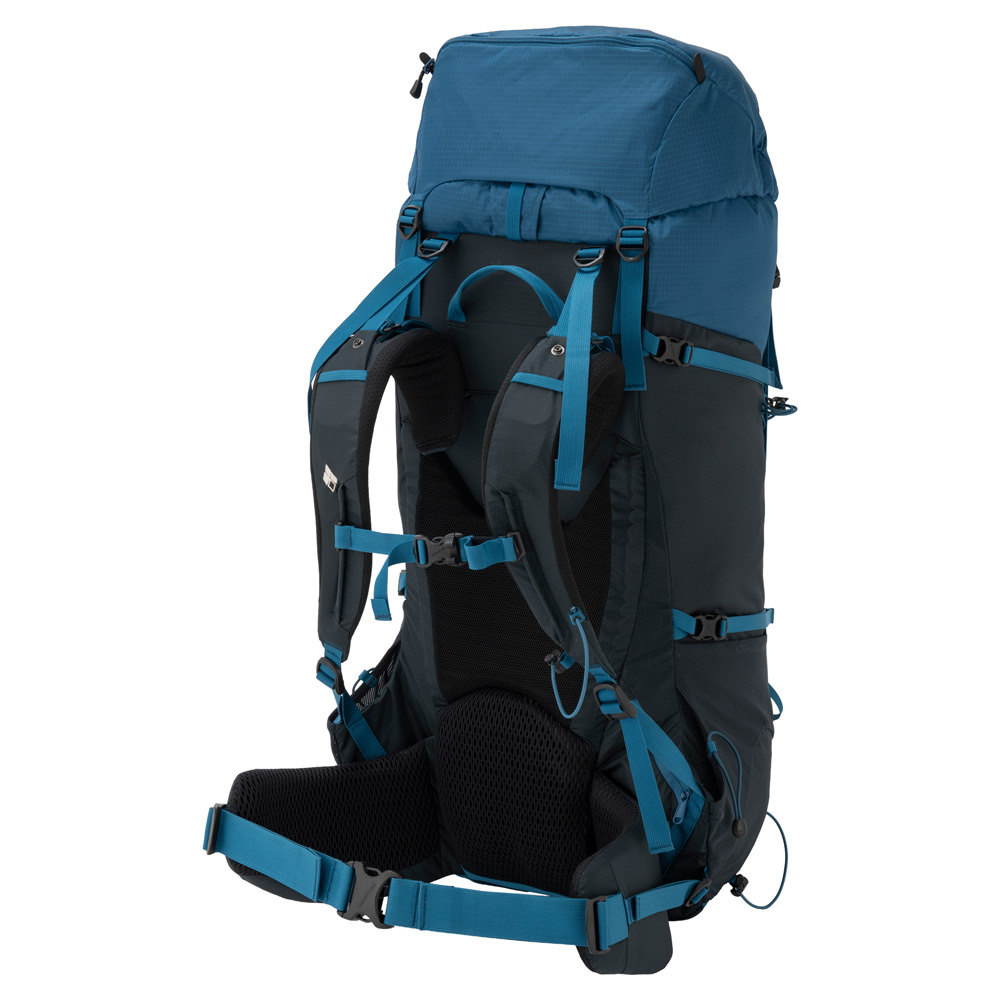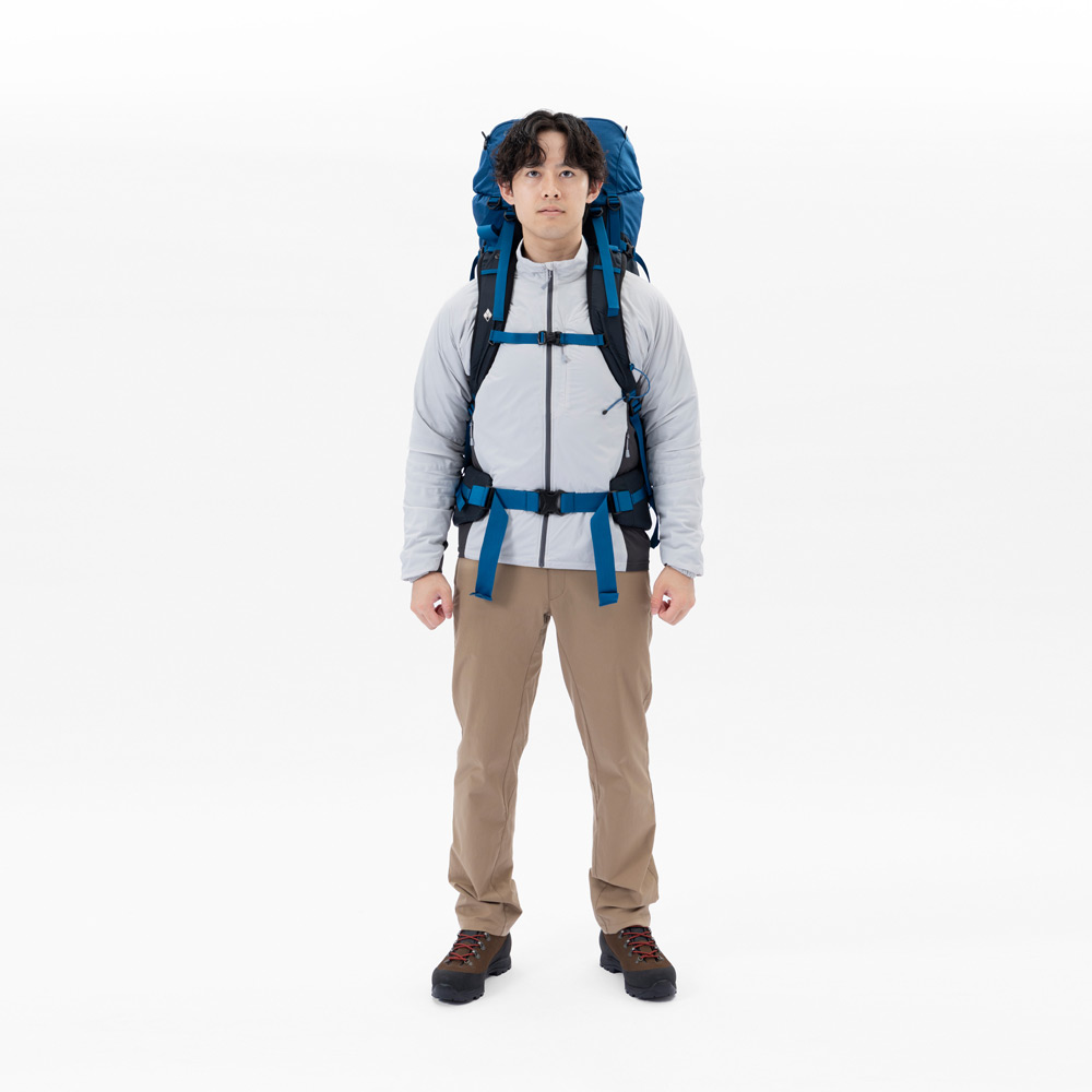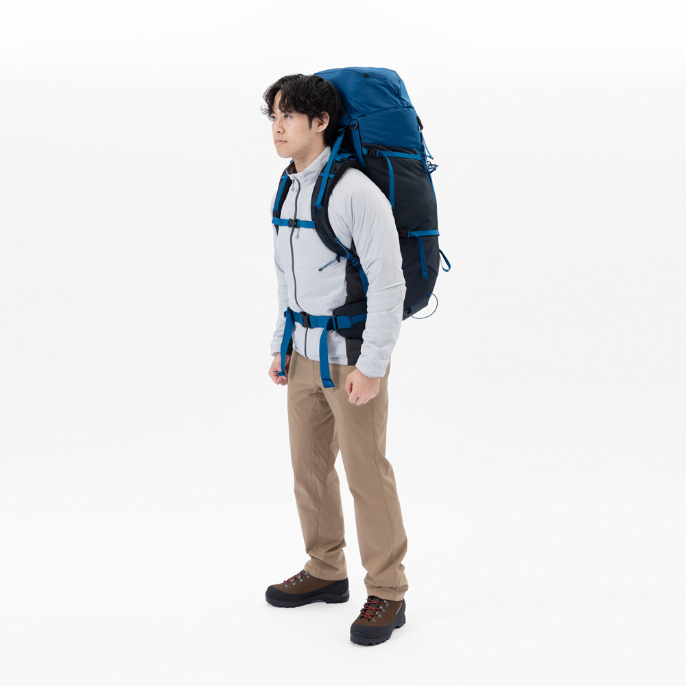 軽量でシンプルな構造ながらも、必要な機能を備えた大型バックパックです。2、3泊程度のテント泊山行に適した容量です。腕振りを妨げないスリムなシルエット。ショルダーハーネスの取付位置を変えることで背面寸法を調節し、体格に合わせて簡単にフィッティングすることが可能です。本体をしっかりと腰回りで支えるヒップベルトは、荷重を分散し、肩への負担を軽減します。専用パックカバー付き。