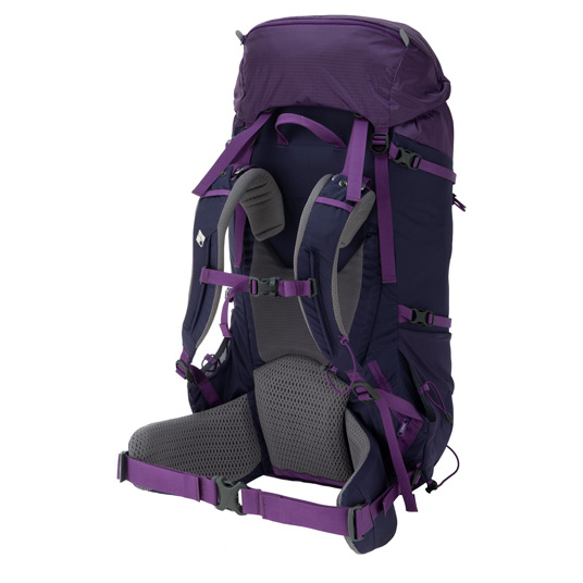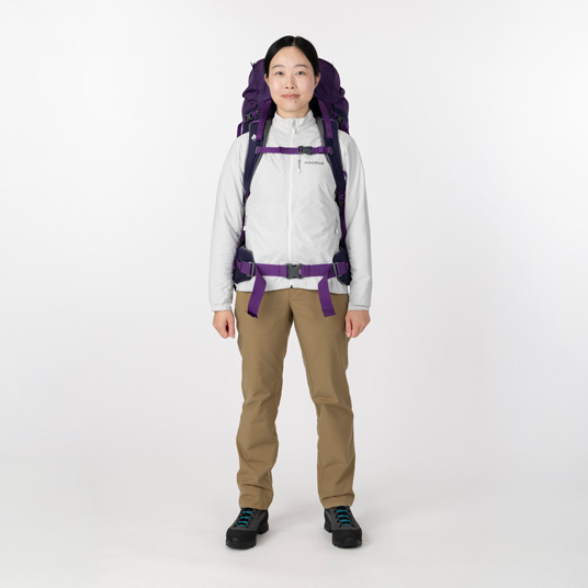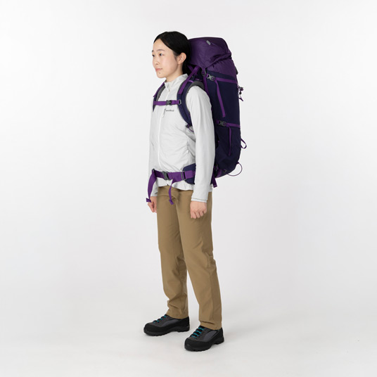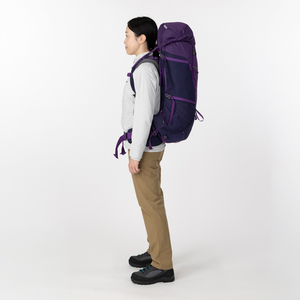 軽量でシンプルな構造ながらも、必要な機能を備えた大型バックパックの女性用モデルです。2、3泊程度のテント泊山行に適した容量です。腕振りを妨げないスリムなシルエット。ショルダーハーネスの取付位置を変えることで背面寸法を調節し、体格に合わせて簡単にフィッティングすることが可能です。本体をしっかりと腰回りで支えるヒップベルトは、荷重を分散し、肩への負担を軽減します。専用パックカバー付き。