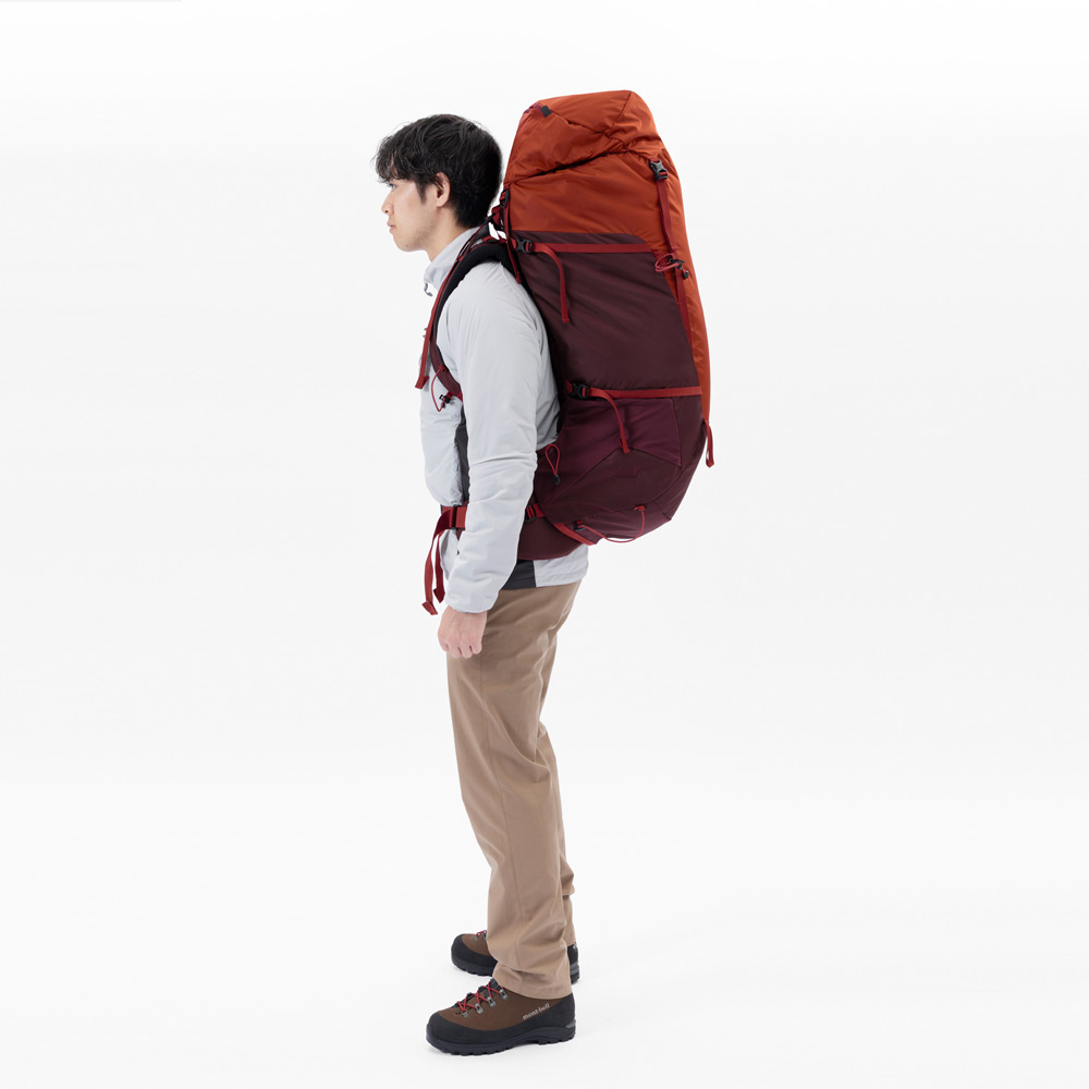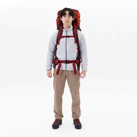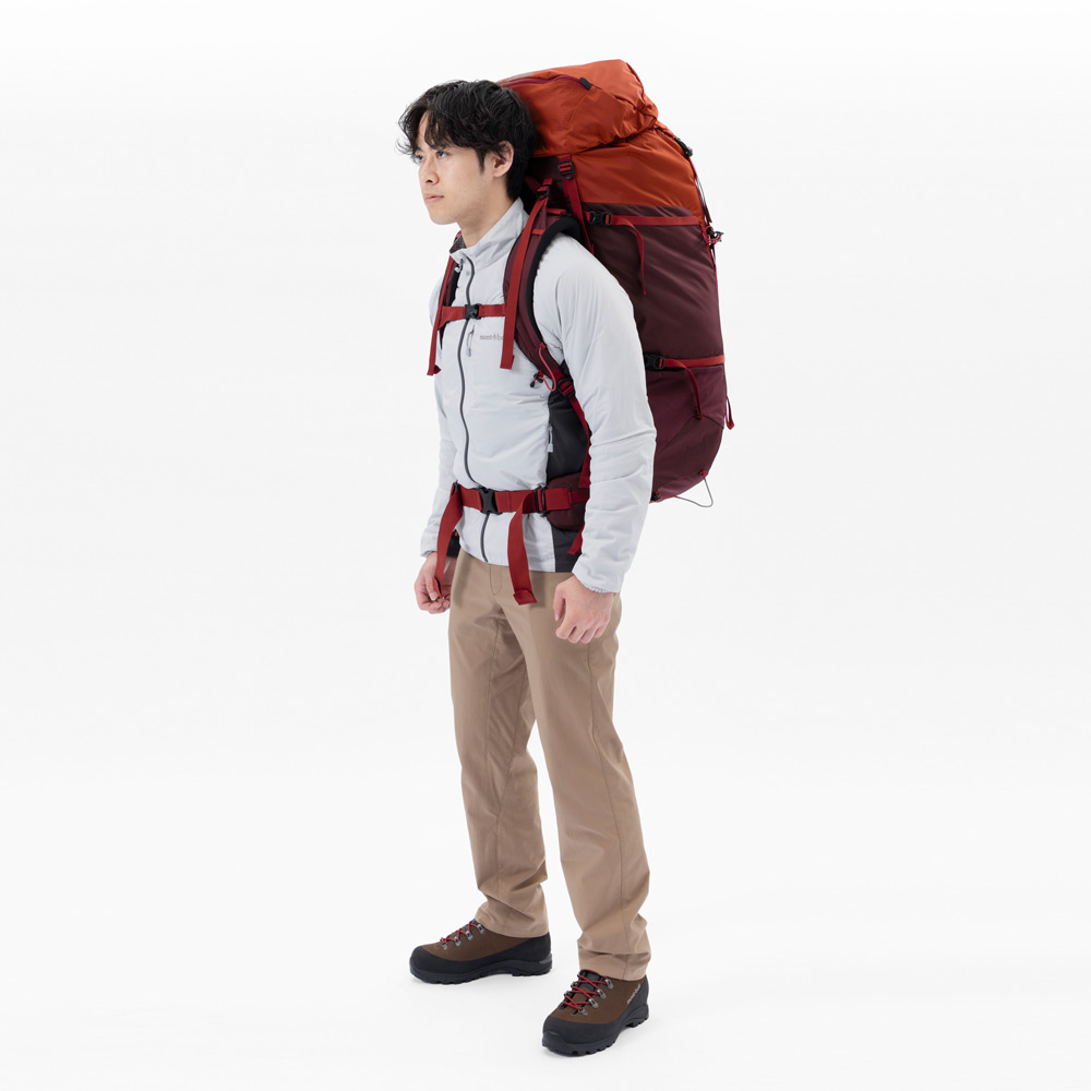 軽量でシンプルな構造ながらも、必要な機能を備えた大型バックパックです。ショルダーハーネスの取付位置を変えることで背面寸法を調節し、体格に合わせて簡単にフィッティング可能。安定感のある背負い心地を実現します。本体をしっかりと腰回りで支えるヒップベルトは、荷重を分散し、肩への負担を軽減します。長期縦走や海外遠征など、幅広い状況で活躍します。専用パックカバー付き。