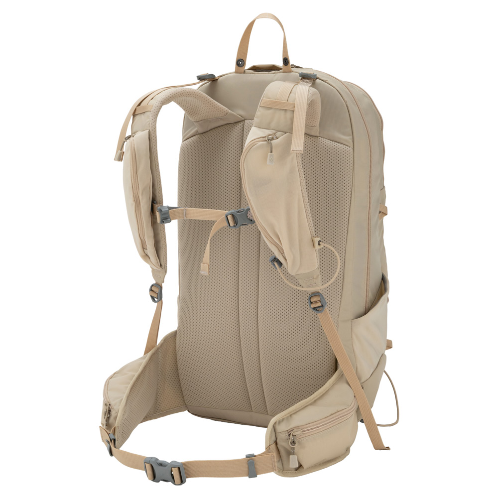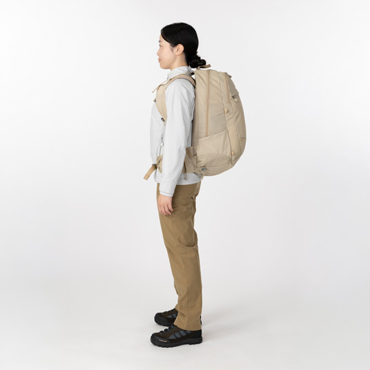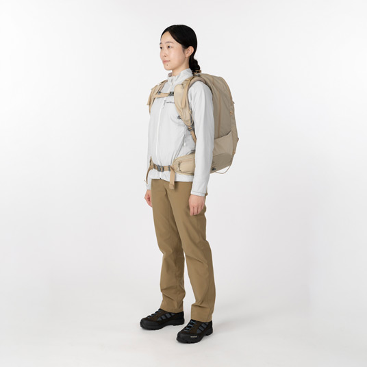 多彩な機能を備えた中型バックパックの女性用モデルです。メイン気室とフロント気室の2気室の構成で、行動中にアクセスしやすいショルダーポケットやウエストポケットなどを備えています。専用パックカバー付き。アイヌ語で山を意味する「Nupuri(ヌプリ)」が名前の由来です。