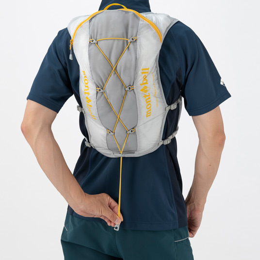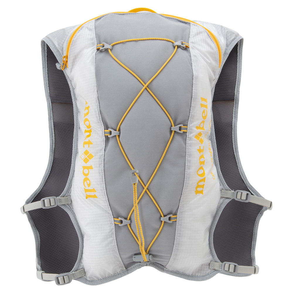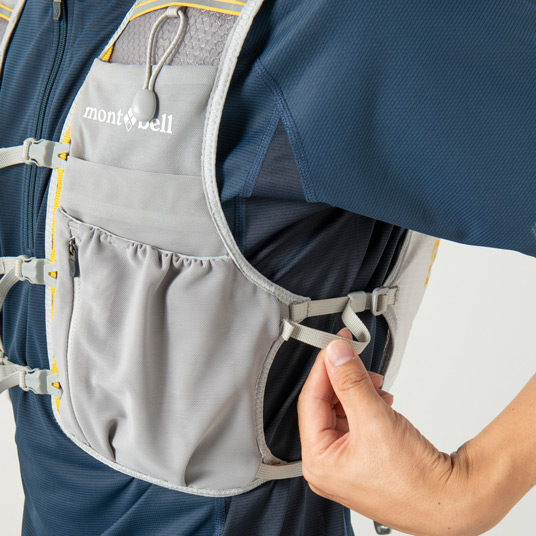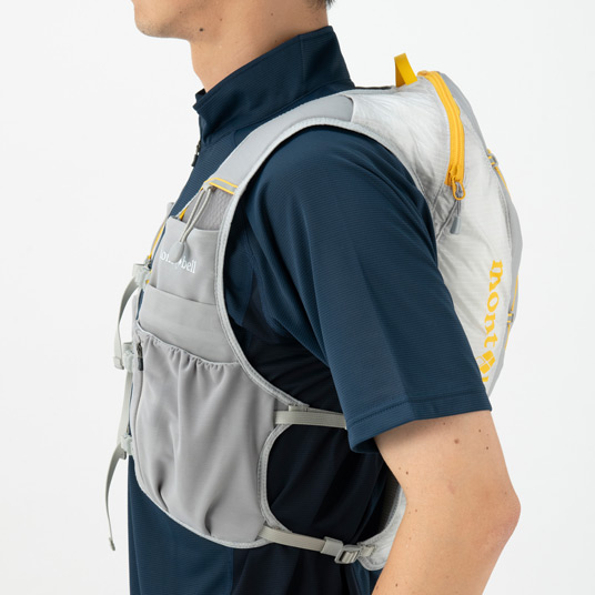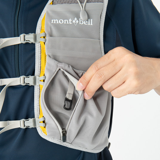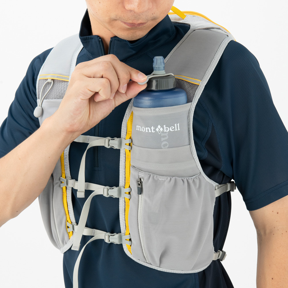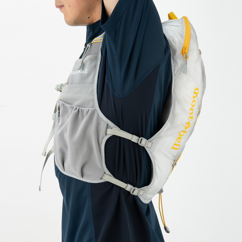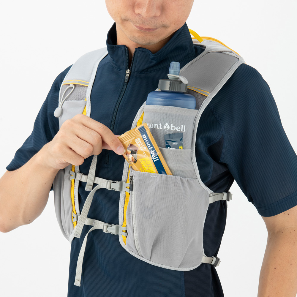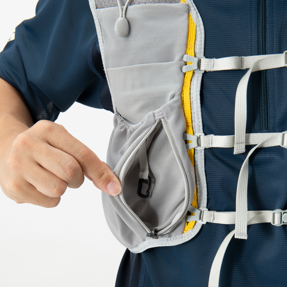 【特長】ジッパー付きポケット / 前身頃にボトル用ポケット / ボトル落下防止のループ / 携帯電話などの収納に便利なポケット / 行動食などが取り出しやすい間口の広いポケット / ポケット内部にキーリーシュ / 視認性を高める反射材 / 背面側は防寒具などを収納できる小型パック / 調整テープ末端は収納可能 / トレールウォーターパック(2.0L)対応