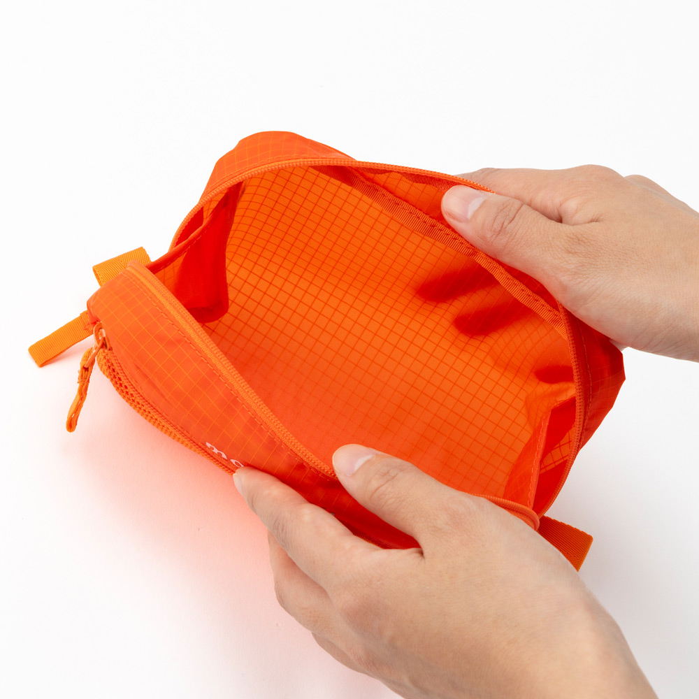 小物類を使い勝手よく収納できる仕分けポーチです。ジッパーが大きく開くので出し入れしやすく、開けた時に中の物がこぼれ落ちない仕様になっています。