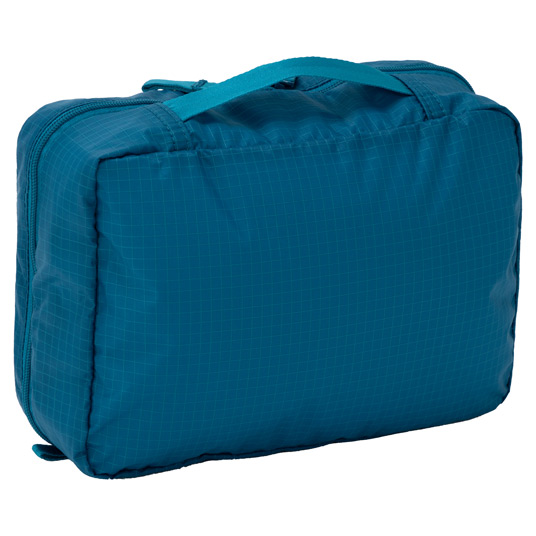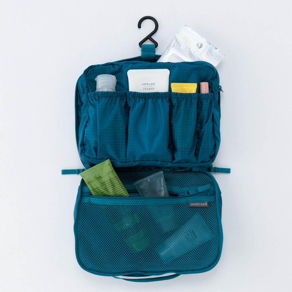 旅行用の小物等を機能的に収納できるポーチです。フックを備えているので、広げてホテルの洗面台やタオル掛けはもちろん、木の枝やロープなど、さまざまな場所に吊して使用することができます。歯ブラシを収納できるサイズで、ジッパーを閉めるとコンパクトにまとまり、ハンドルつきで持ち運びにも便利。トラベルからキャンプまであらゆるシーンで活用できます。