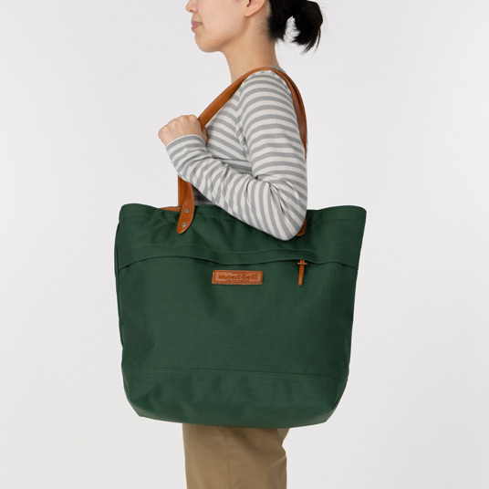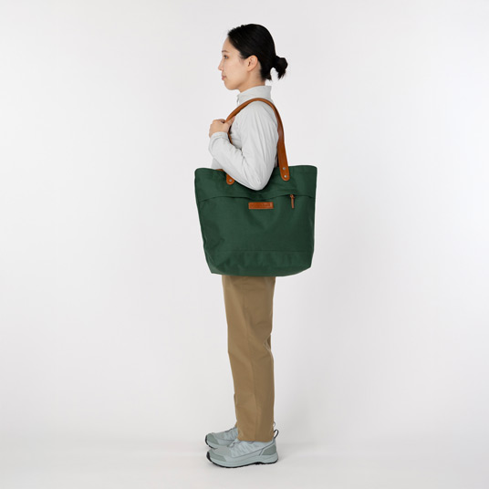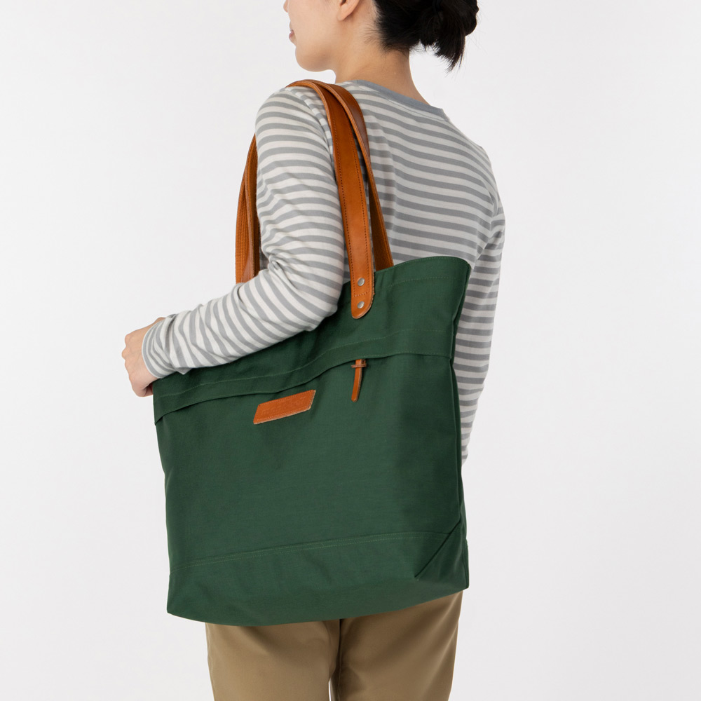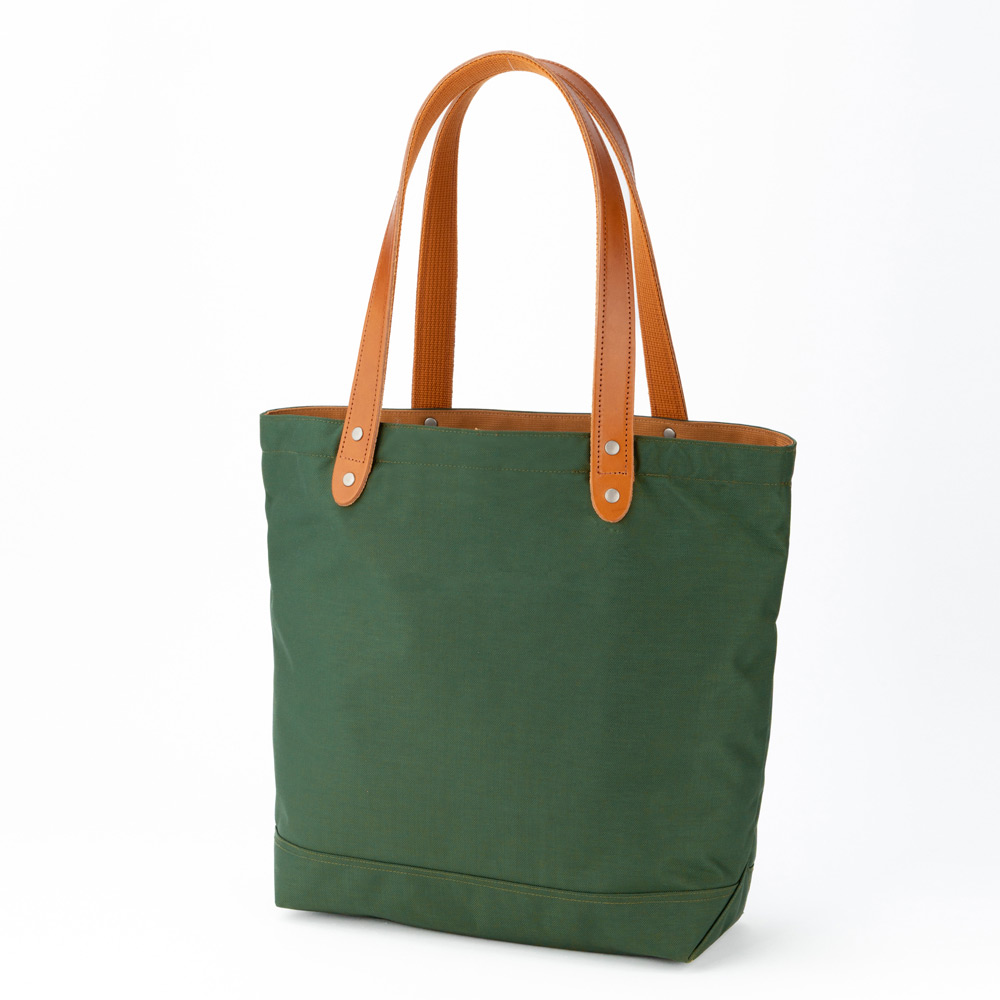 耐久性に優れた素材を使用した丈夫なトートバッグです。B4サイズに対応します。開口部は真ん中のスナップボタンで閉じることができ、荷物が飛び出しにくくなっています。ハンドグリップには上質で厚みのある牛革を使用しています。