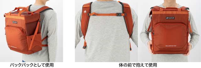 「バックパックとして背負う」「体の前で抱える」の2通りの使い方ができます。