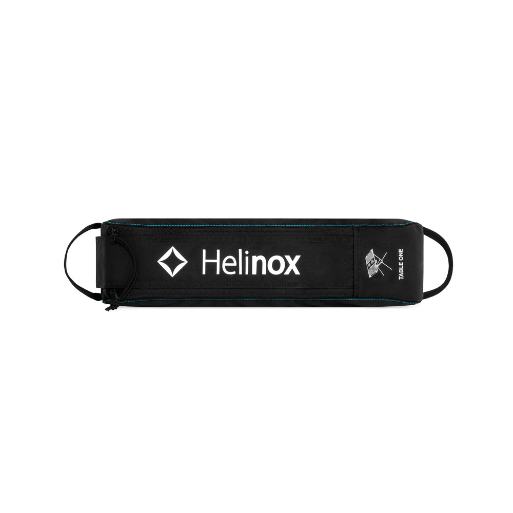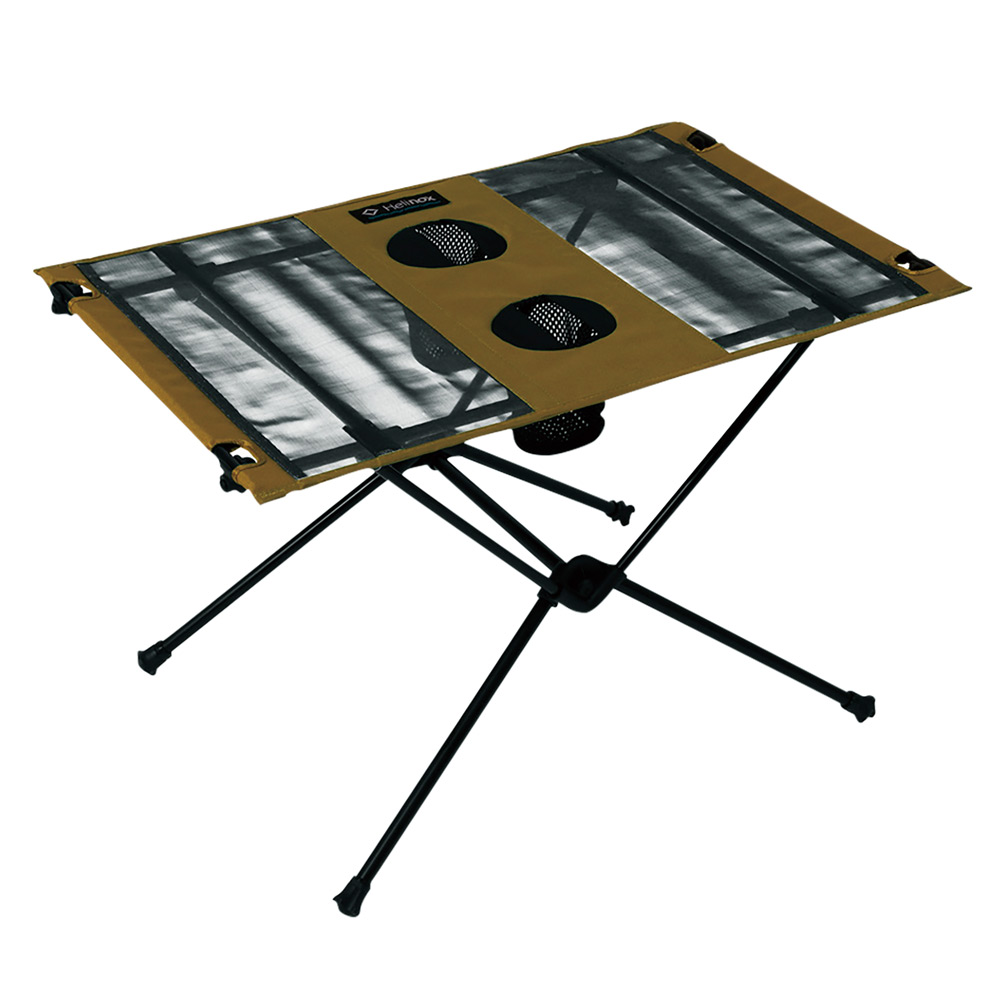 軽量・コンパクトで持ち運びに便利な折り畳みテーブルです。天面は軽量な生地とフレームで構成され、収納時には筒状に巻くことでコンパクトになります。使用時はフレームのテンションを生かして天面の生地の張りをしっかりと保つ構造です。ヘリノックスの「チェアワン」シリーズのチェアなどとの組み合わせを想定したサイズ設計です。天面の中央にカップホルダーが2個ついています。スタッフバッグ付き。
