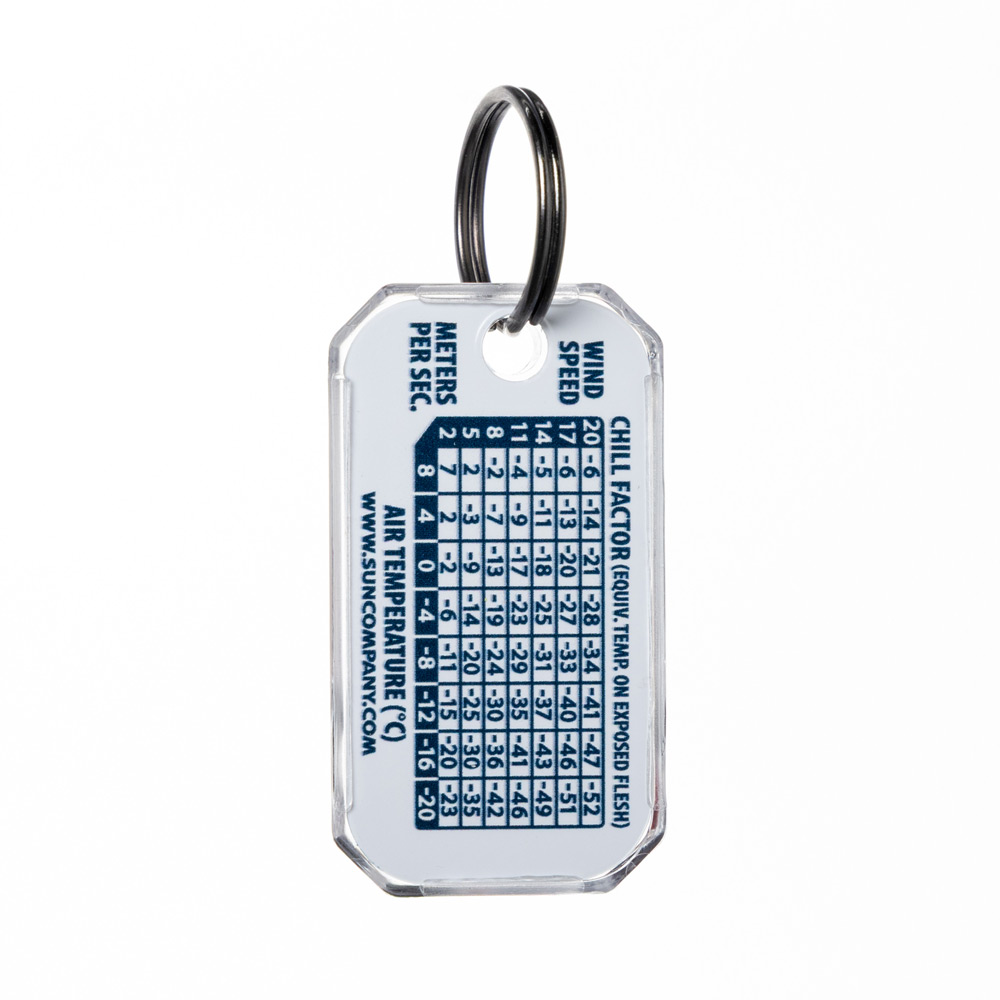 温度計は摂氏(°C)と華氏(°F)を測定できます。コンパスの四方位には蓄光素材を使用し、暗所での視認性を高めています。裏面に、気温と風速から体感温度がわかる、一覧表付き。