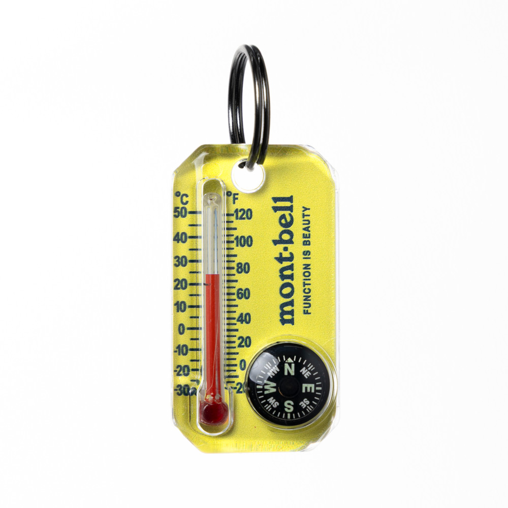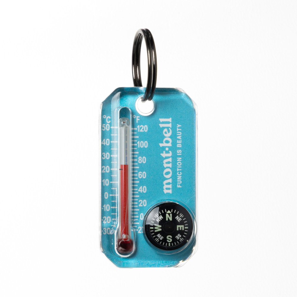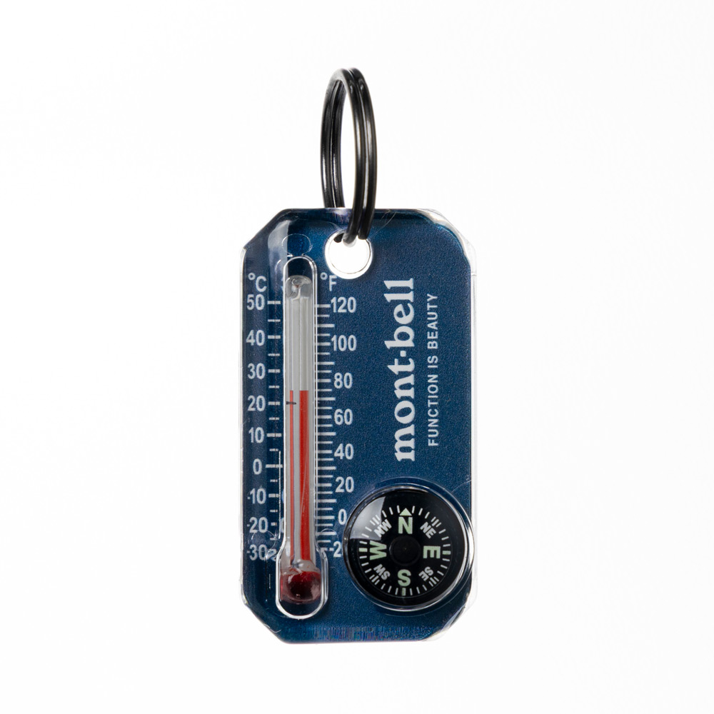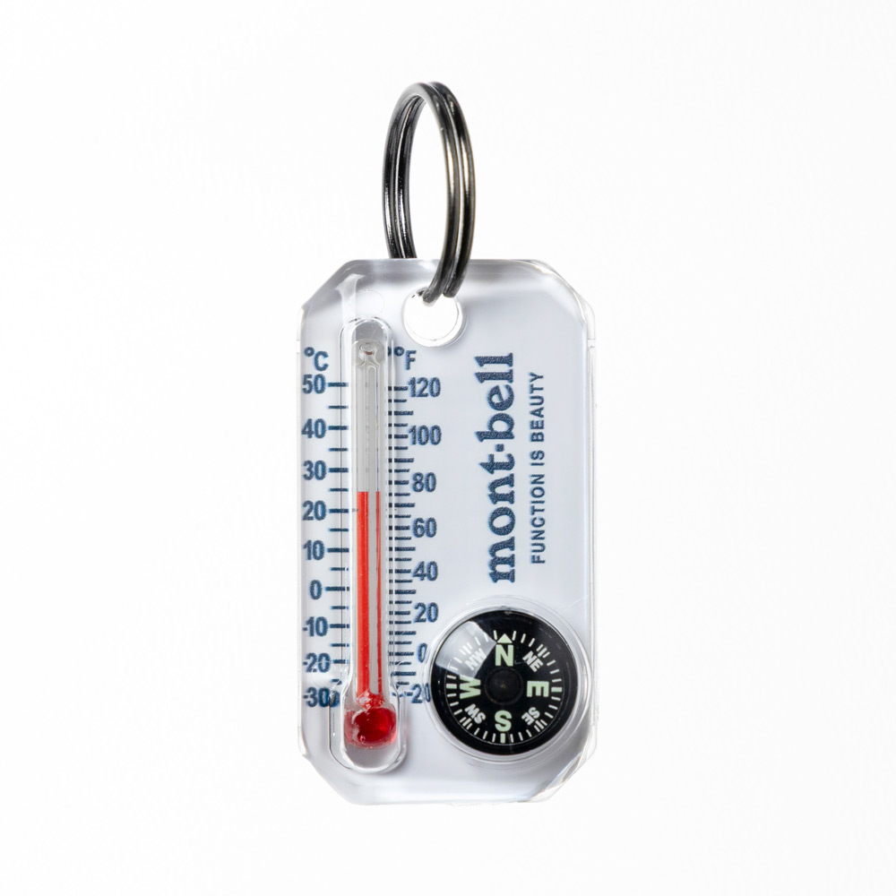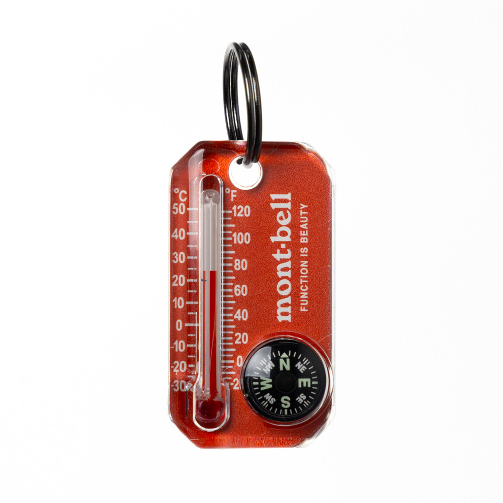 温度計とコンパスを一つにしたキーホルダーで、モンベルのロゴをあしらったオリジナルデザインです。