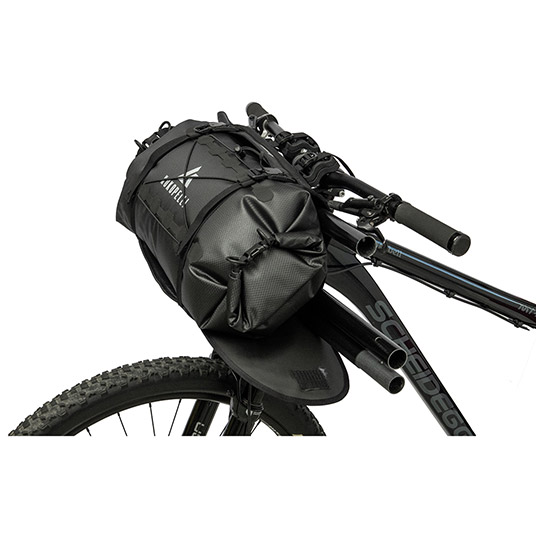 自転車のハンドルバーにパックラフトと4ピースパドルを効率よく積載するために設計されたハンドルバーバッグ&ハーネスです。付属のロールアップ式ハンドルバッグには、ローグライト、ローグ(旧モデル)、ホーネットライト(旧モデル)を収納した状態でハーネスに固定できます。その他のモデルはロールアップした状態で直接ハーネスに固定することで、自転車に積載可能です。パドルは専用設計のスリーブとベルクロでしっかりと固定されます。ハーネスは、パックラフトだけでなくテントやドライバッグなど、円柱状のものを固定することができます。付属のハンドルバーバッグは、パックラフト以外の物を入れハーネスに固定することで、一般的なハンドルバーバッグとしても使えます。幅広い自転車に対応できるよう、スペーサーも付属しています。