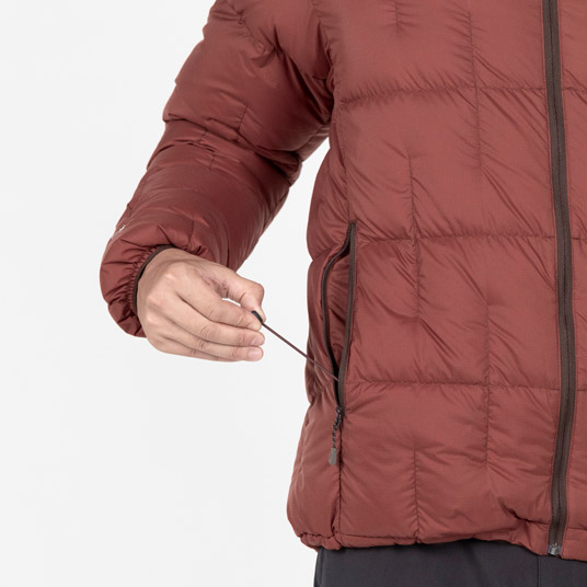 【収納サイズ】φ15 x 25cm【特長】独自のキルティングパターン / ダウンプルーフ加工 / デュアルアクスルフード / シングルキルト構造 / ジッパーがあごに当たらない仕様 / リードインコード・システム / スタッフバッグ付き【ポケット】4個(ジッパー付き〈腰2〉、ジッパーなし〈内2〉)