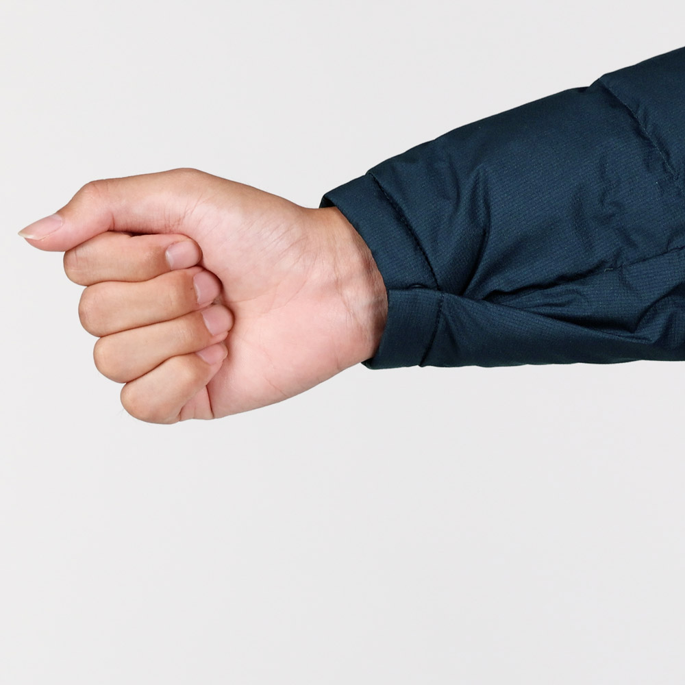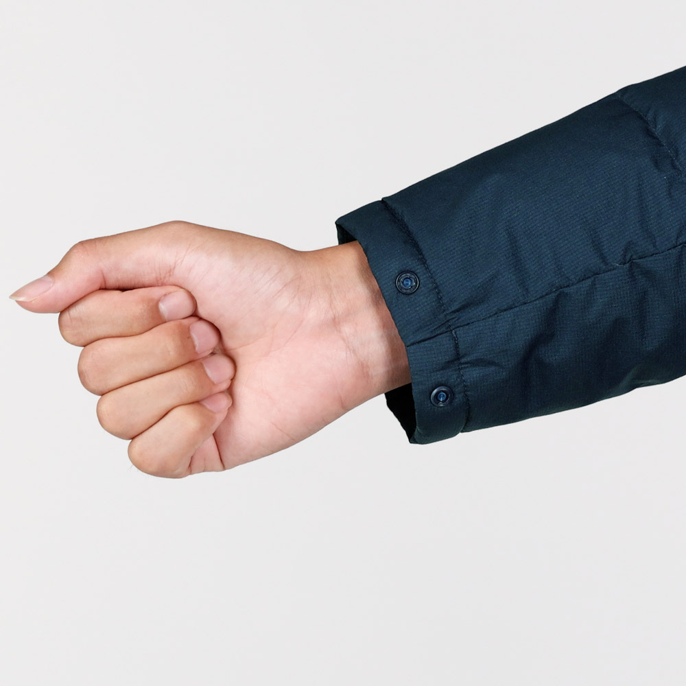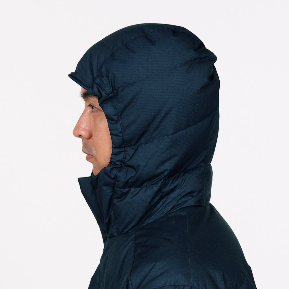 【特長】三枚差し構造(身頃、袖) / シングルキルト構造(フード) / ダウンプルーフ加工 / ジッパーがあごに当たらない仕様 / スタッフバッグ付き