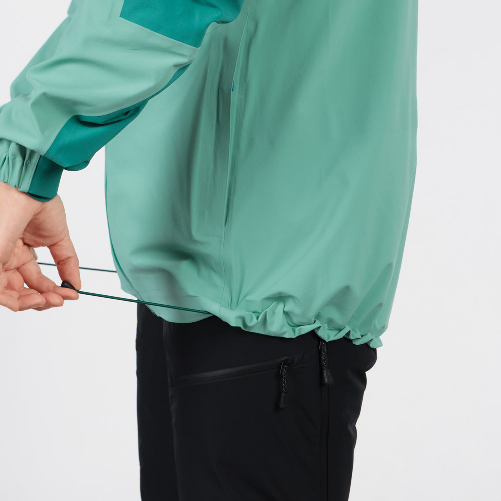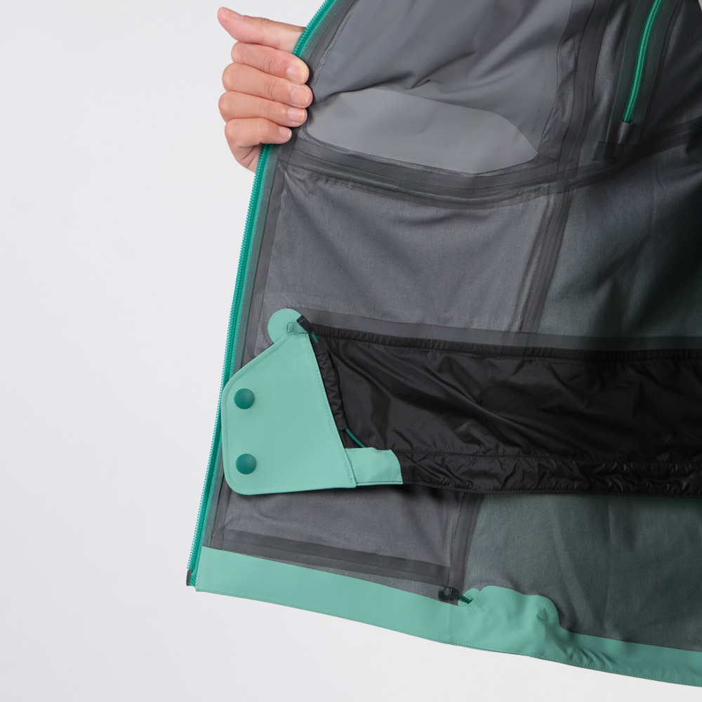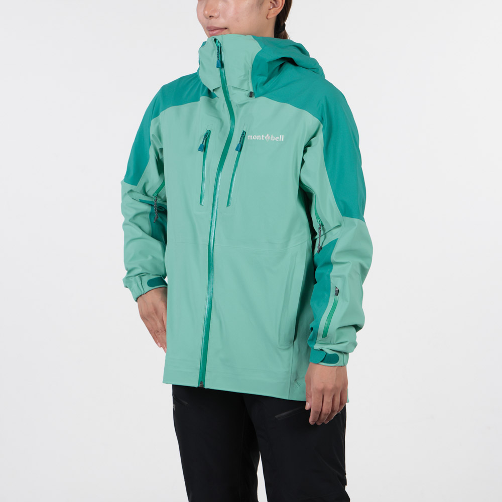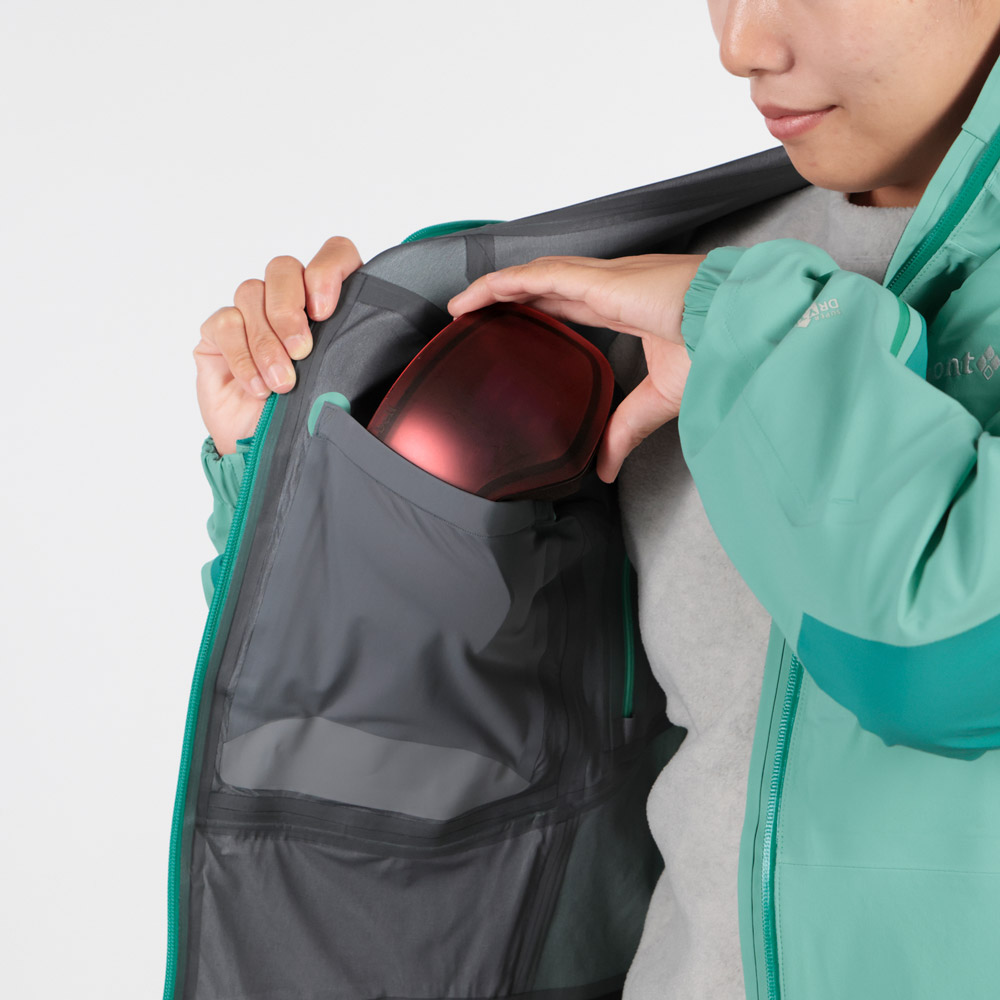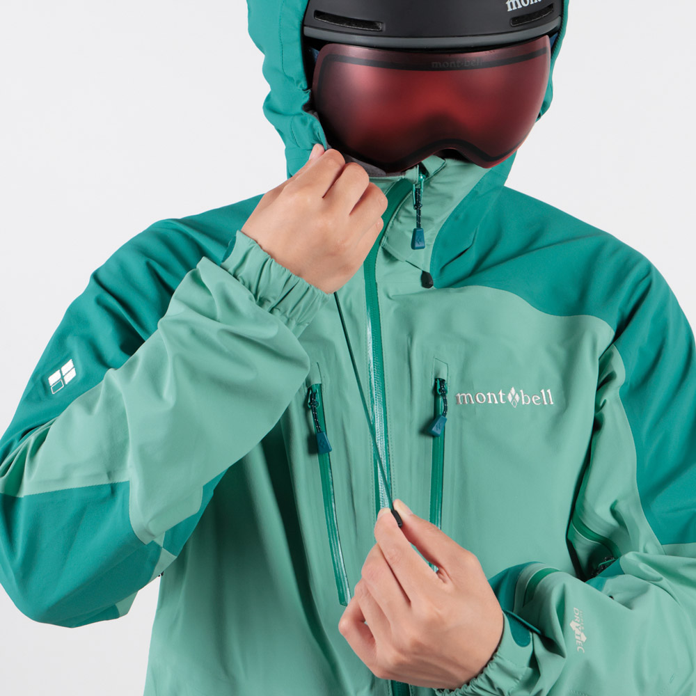 【特長】トライアクスルフード / フィット感を高める独自の立体フードパターン / 高めの襟元 / ジッパーが顔に当たらない仕様 / 立体裁断(肘) / アルパインカフ / アクアテクト®ジッパー / エアレーションシステム / 滑り止め付きウインドスカート / 裾の調節は前身頃内側 / リフト券やICチップを入れられる左袖のポケット / 取り外して洗濯できる口元パーツ / 薄くて軽量な13mm幅のシームテープ / 1WAYストレッチ / スタッフバック付き