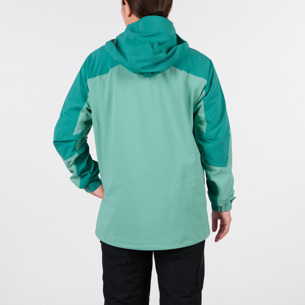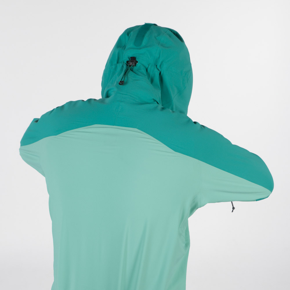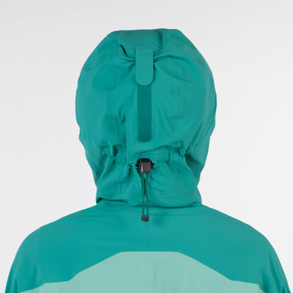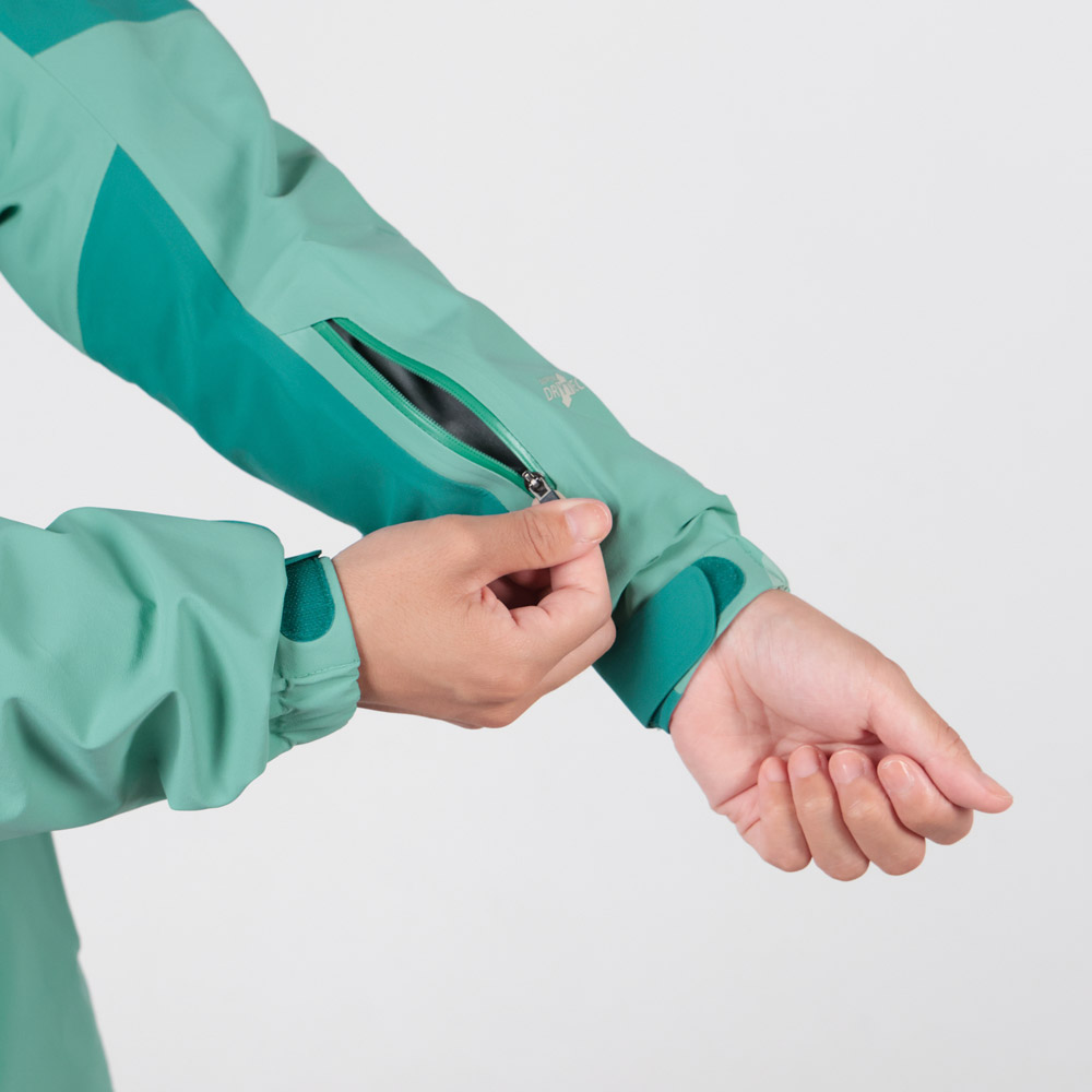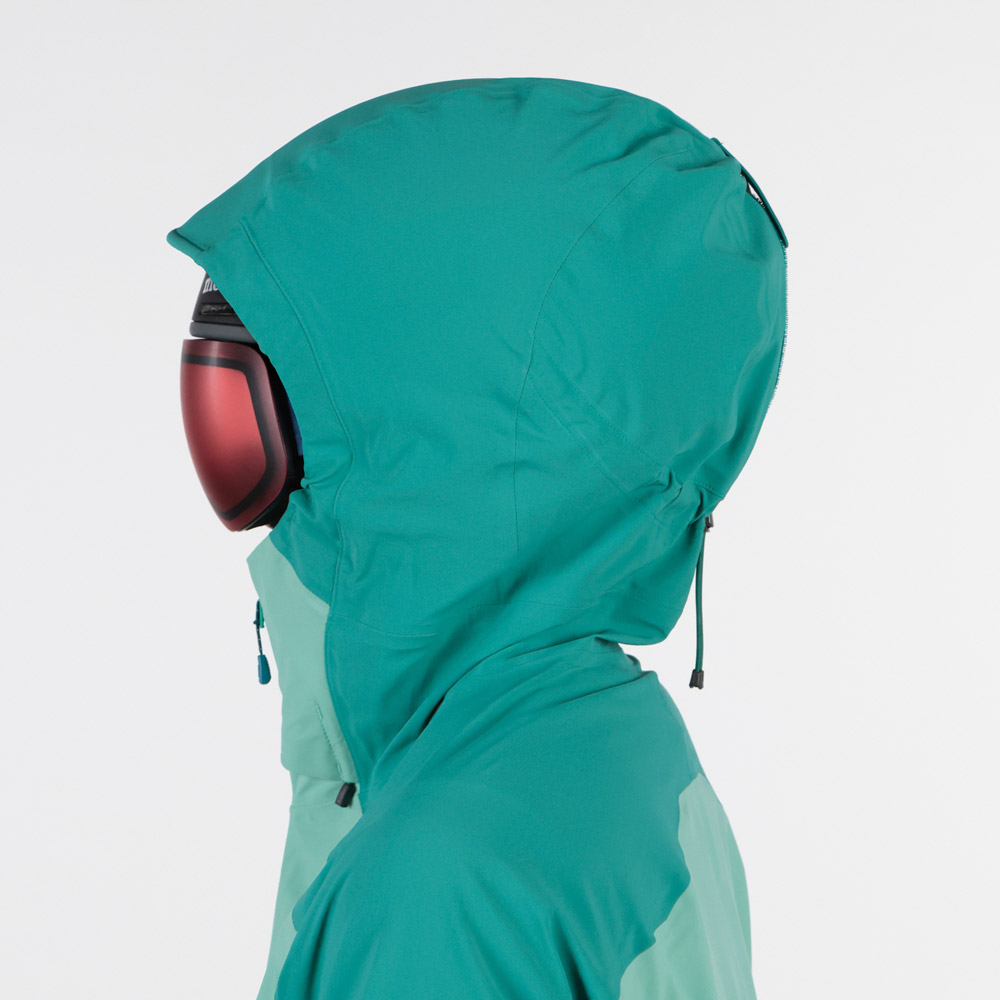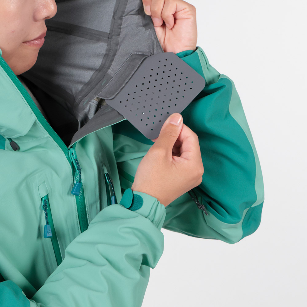 【特長】トライアクスルフード / フィット感を高める独自の立体フードパターン / 高めの襟元 / ジッパーが顔に当たらない仕様 / 立体裁断(肘) / アルパインカフ / アクアテクト®ジッパー / エアレーションシステム / 滑り止め付きウインドスカート / 裾の調節は前身頃内側 / リフト券やICチップを入れられる左袖のポケット / 取り外して洗濯できる口元パーツ / 薄くて軽量な13mm幅のシームテープ / 1WAYストレッチ / スタッフバック付き