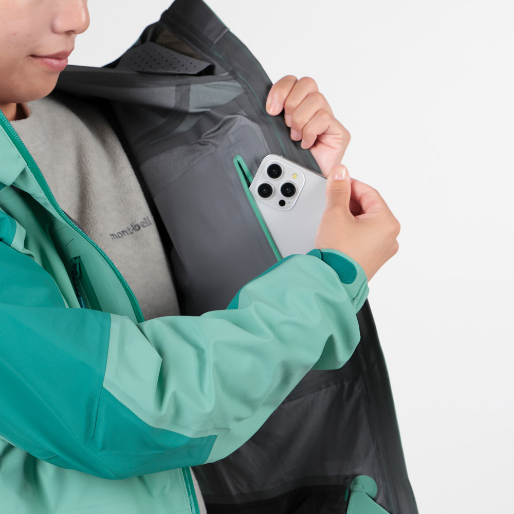 本製品は縫い目を目止め(シームテープ)処理することで身体側に水が浸入しないように設計されていますが、構造上ポケットの内部は浸水する恐れがあります。貴重品等は防水ケースに入れるなどして防水対策をしてください。