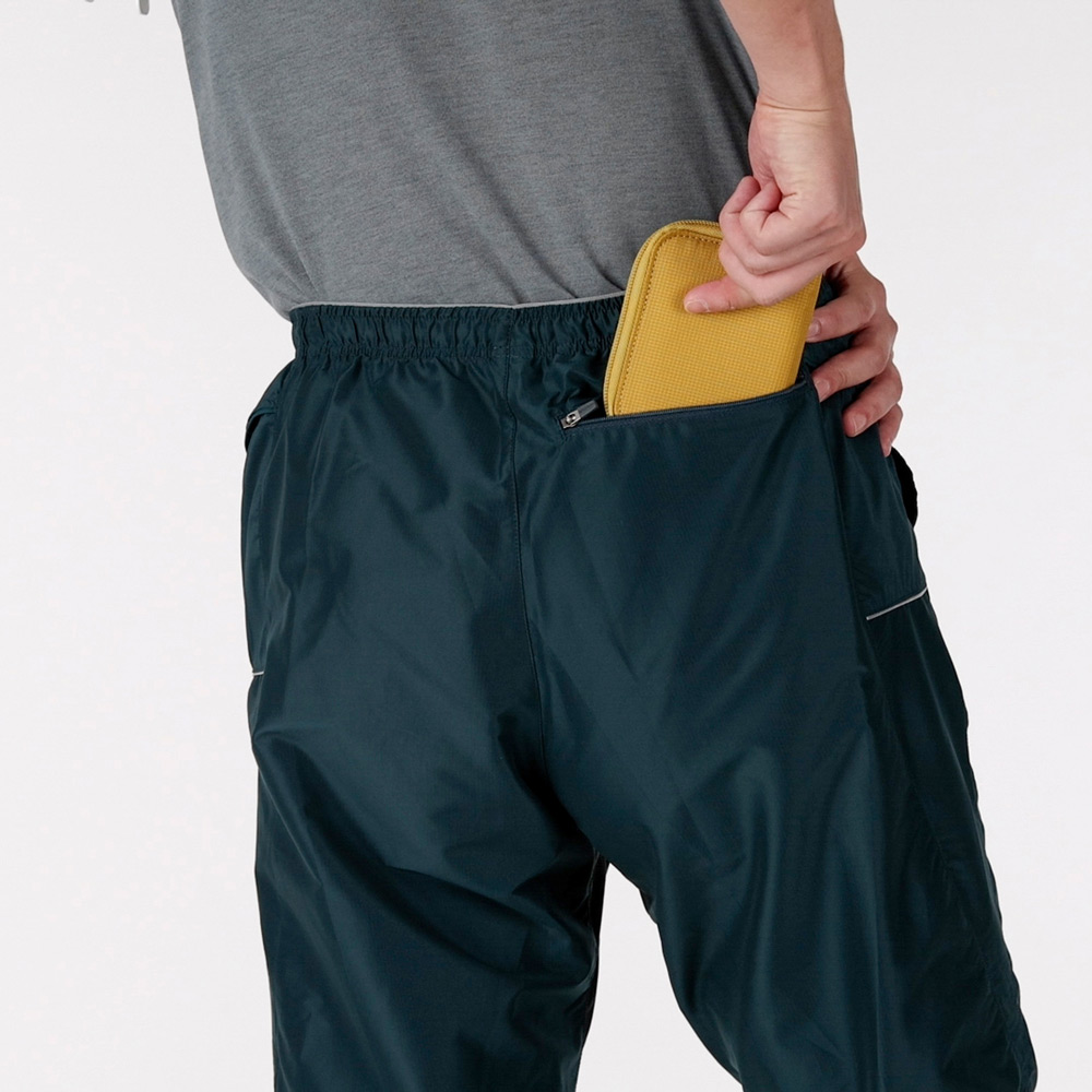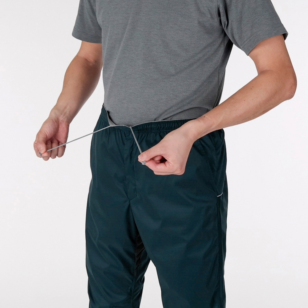 【特長】1WAYストレッチ / 立体裁断(ひざ) / 股にニット素材のマチ付き / 左右脇に反射テープ / ウエストはゴムとひもでフィット感の調節が可能 / フロントジッパーなし
