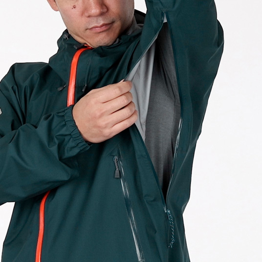 生地の縫い合わせの余分な部分を取り除くことで軽量化し、シームテープ処理を施して防水性を確保。また、表に縫い糸が露出しないため強度にも優れ、非常にしなやかな着心地です。