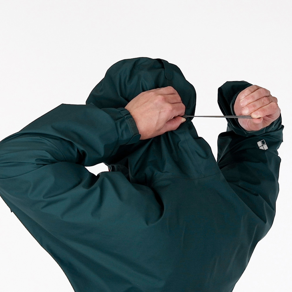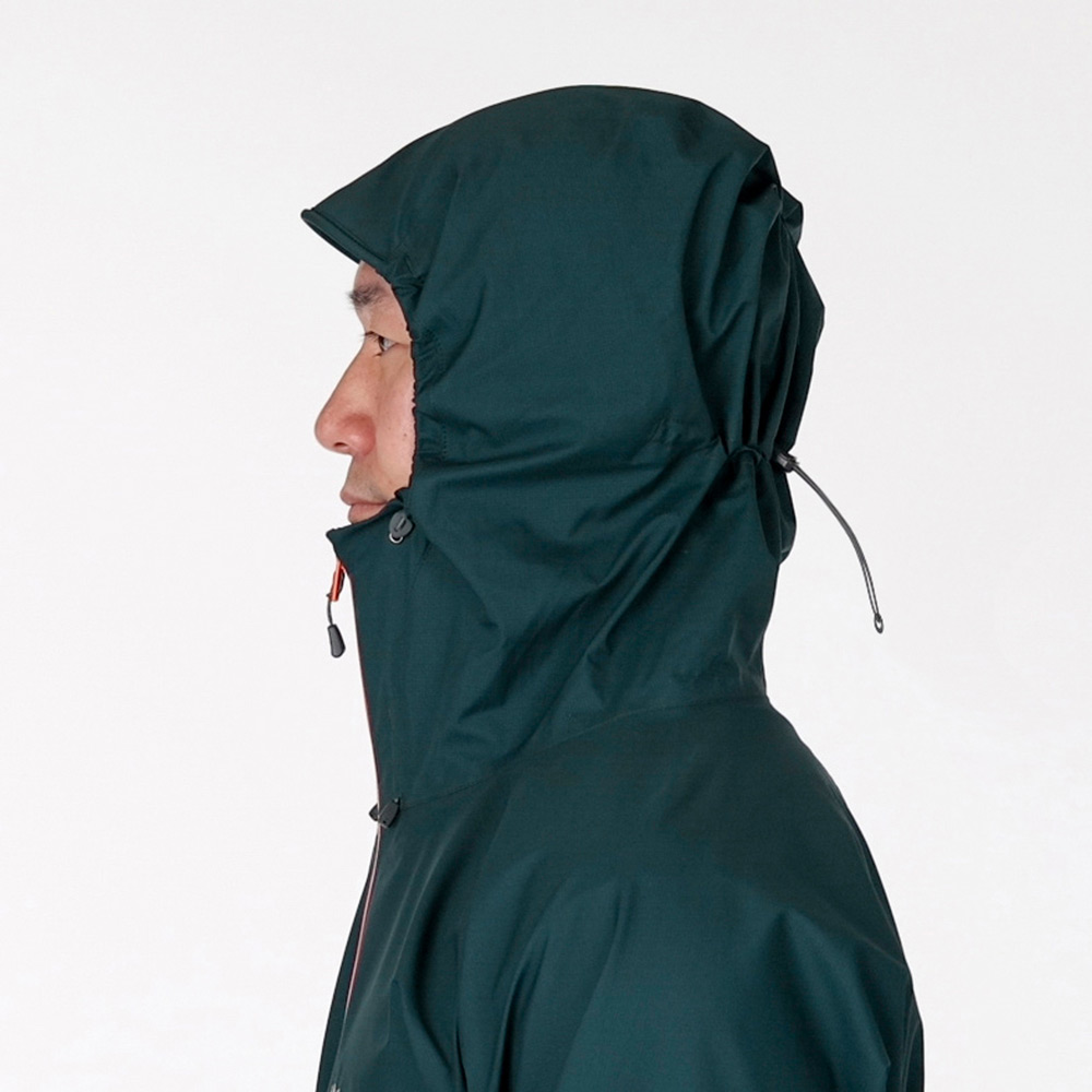 簡単な調節方法で高いフィット感が得られる独自設計のフードです。ドローコードとベルクロで調節すれば顔の動きにぴったりと追随し、良好な視界を確保できます。ひさしは先端に芯を入れたバードビルデザインで、雨や雪を効果的に遮ります。