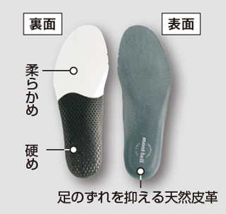前方を柔らかめ、後方を硬めにしてフィット感と安定感を向上。表面には天然皮革を張り、足のずれを防止します。