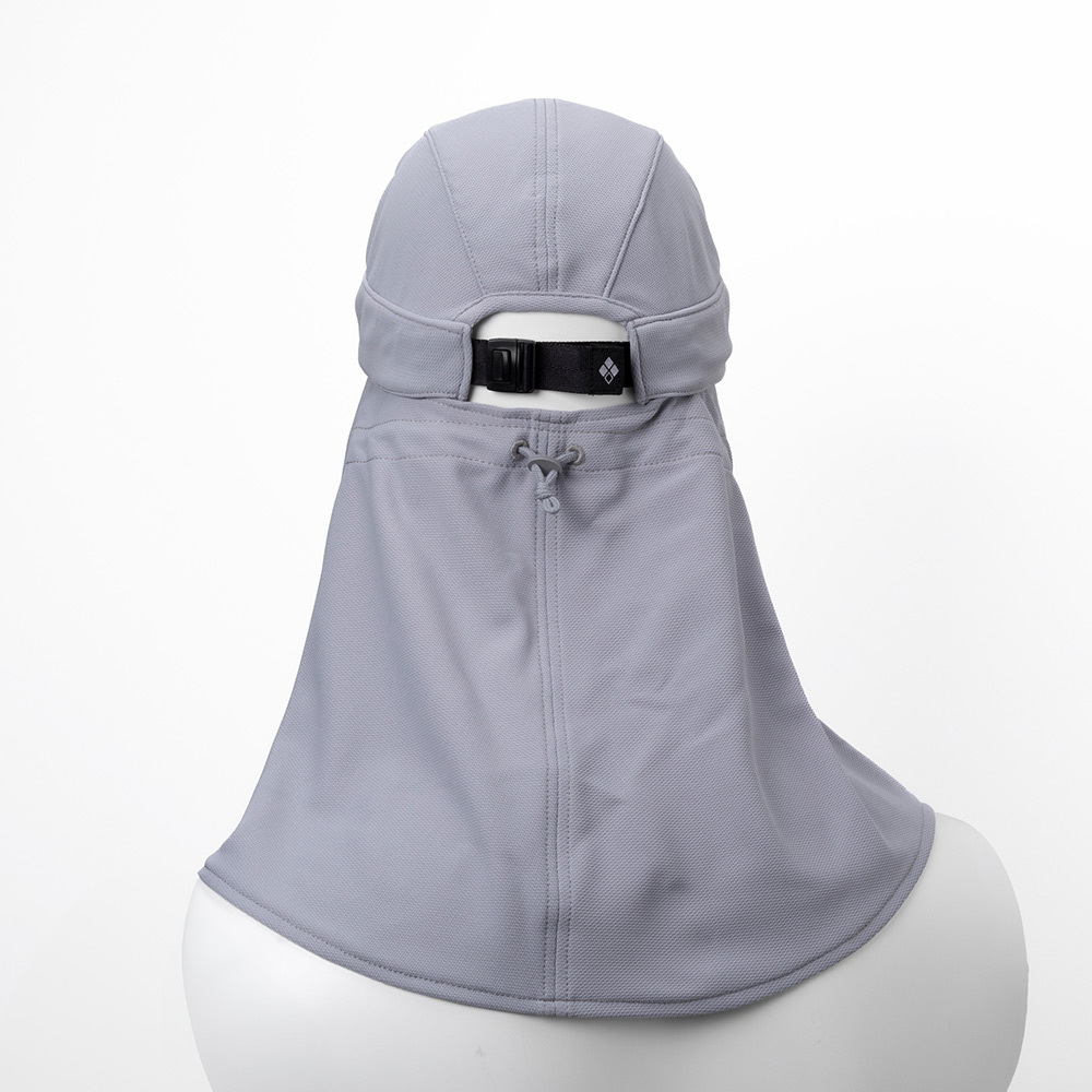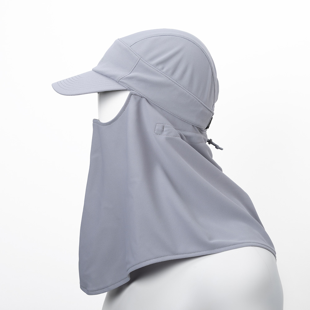 顔から首筋にかけてすっぽりと覆える取り外し可能なシェード付きのキャップです。高い紫外線カット効果を備えたウイックロン®クールを使用。生地には消臭機能を備えています。シェードは後頭部に設けたコードでフィット感を調節することができます。