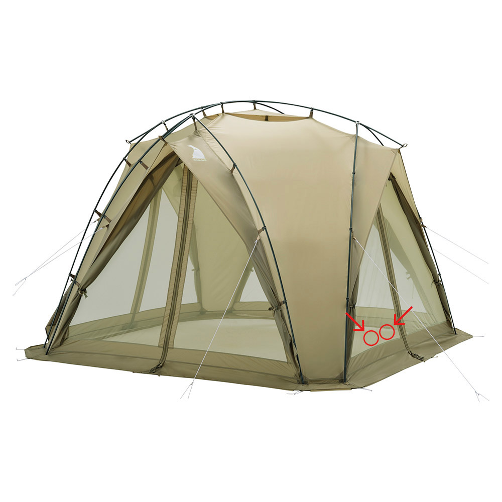 すべての面が生地とメッシュ地の二層になっているので、メッシュ地だけの状態にして蚊帳のようにしたり、4方向を全開にして開放感のある大型タープとして使用することができます。室内から開閉できる独自のベンチレーションシステムにより、雨天時や夏場でも快適に過ごしていただけます。