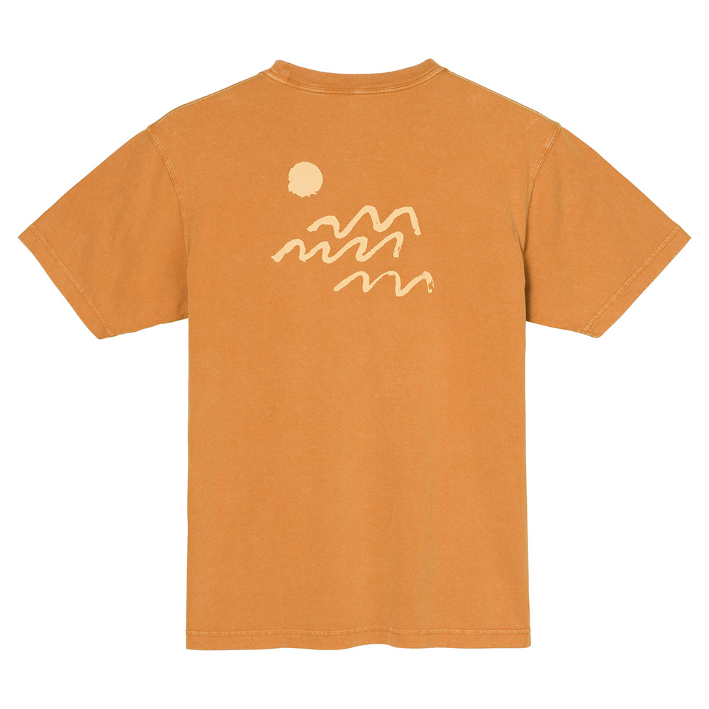 ウォッシュアウト加工をした、しなやかな肌触りの薄手のTシャツです。イラストは背面にプリントされています。