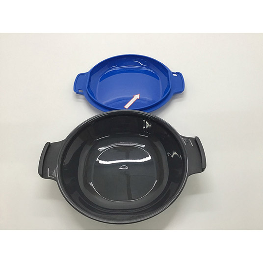 深皿と蓋、カトラリー、つまようじのセットです。深皿はカトラリーですくいやすいデザインになっており、底は持った時に熱が伝わりにくい波状になっています。深皿と蓋は持ち手同士を固定することができ、付属カトラリーは蓋のふちに固定し収納することができます。蓋は浅めのお皿としても使用できます。