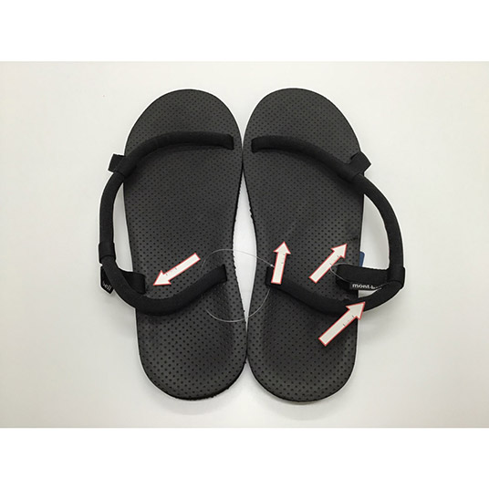 かかとが浮き上がりにくい「スリップオンサンダル」の機能性はそのままに、靴下を着用したままでも履くことができるよう、モンベル独自のS字形状の鼻緒を取り付けたモデルです。甲に直接当たる鼻緒には肌当たりがやさしい素材を使用しています。開放的な履き心地と優れたホールド感を両立し、キャンプや普段使いなどで気軽に着用できます。意匠登録済。