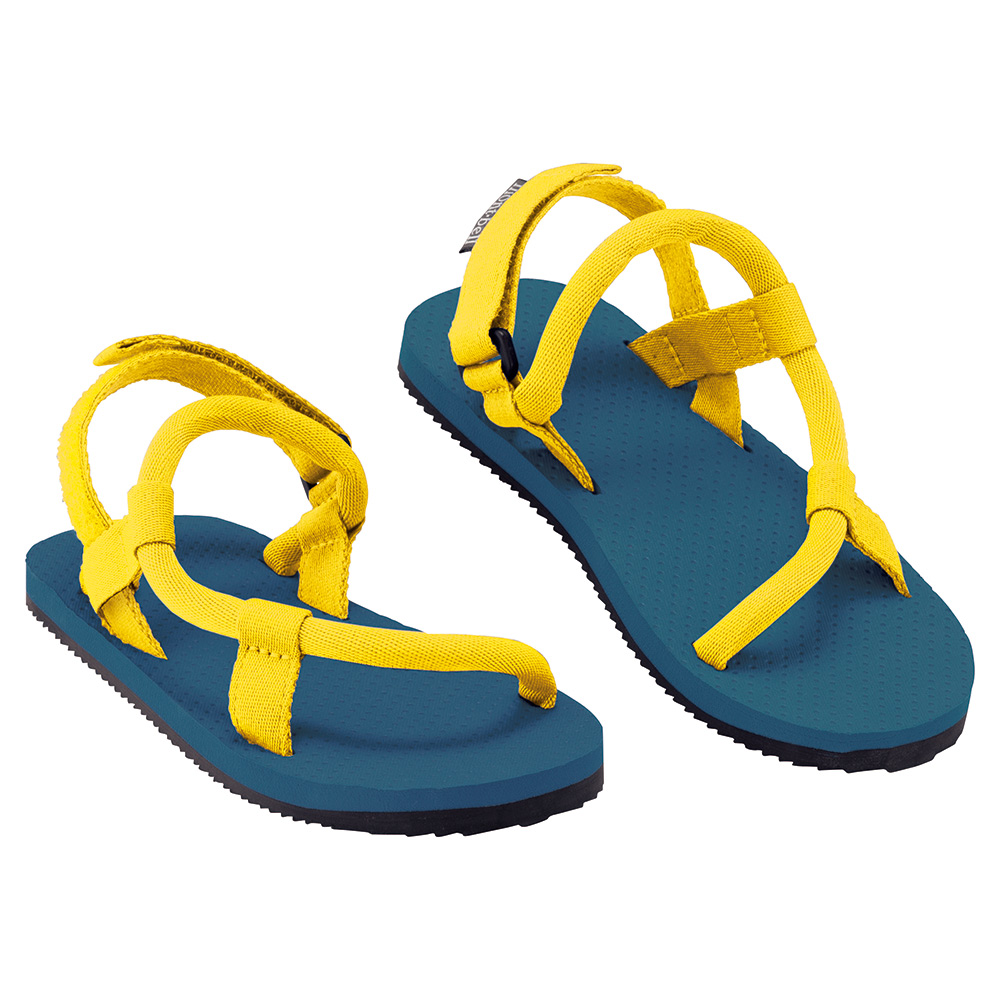 靴下を着用したままでも履くことができる「ソックオンサンダル」に、かかとを固定するバックストラップを設けることで運動時にも脱げにくくなっています。鼻緒には肌当たりがやさしい素材を使用しています。