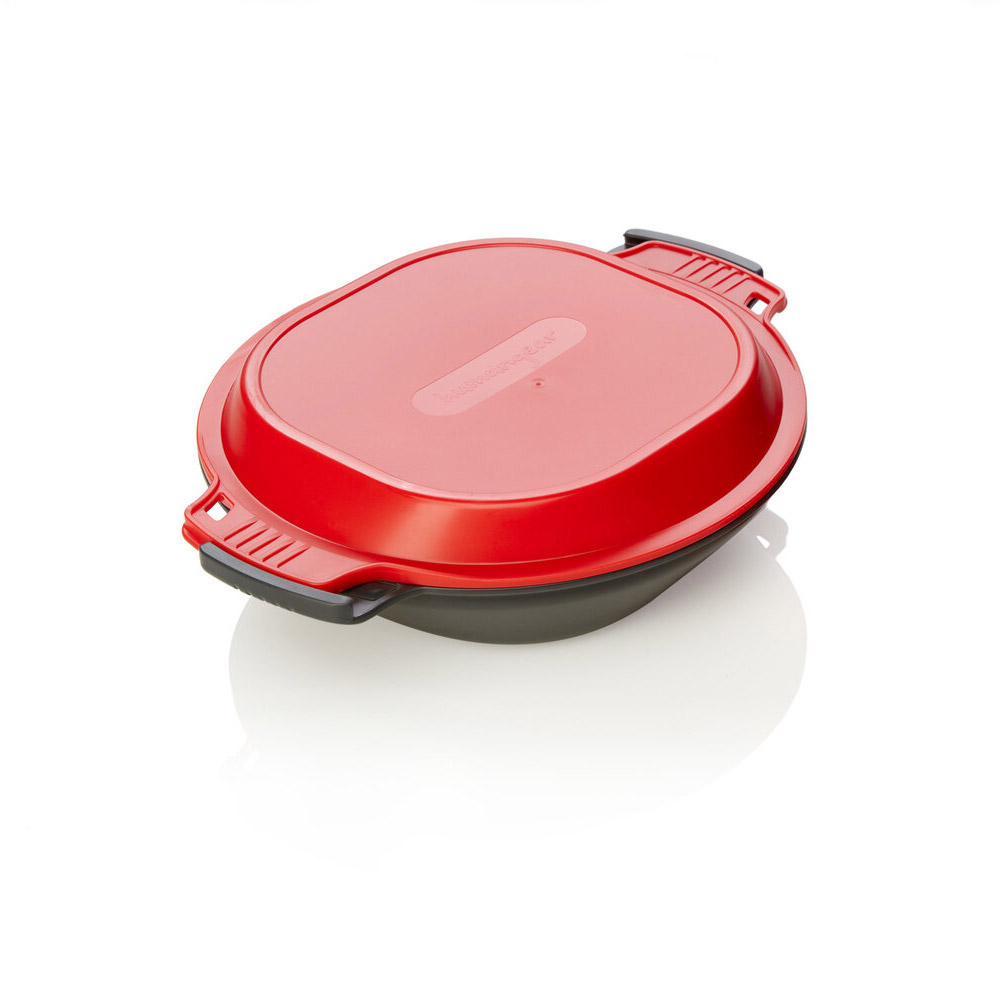 深皿と蓋、カトラリー、つまようじのセットです。深皿はカトラリーですくいやすいデザインになっており、底は持った時に熱が伝わりにくい波状になっています。深皿と蓋は持ち手同士を固定することができ、付属カトラリーは蓋のふちに固定し収納することができます。蓋は浅めのお皿としても使用できます。