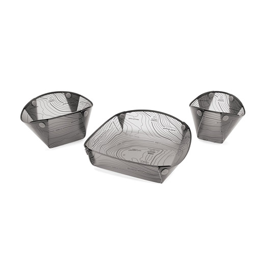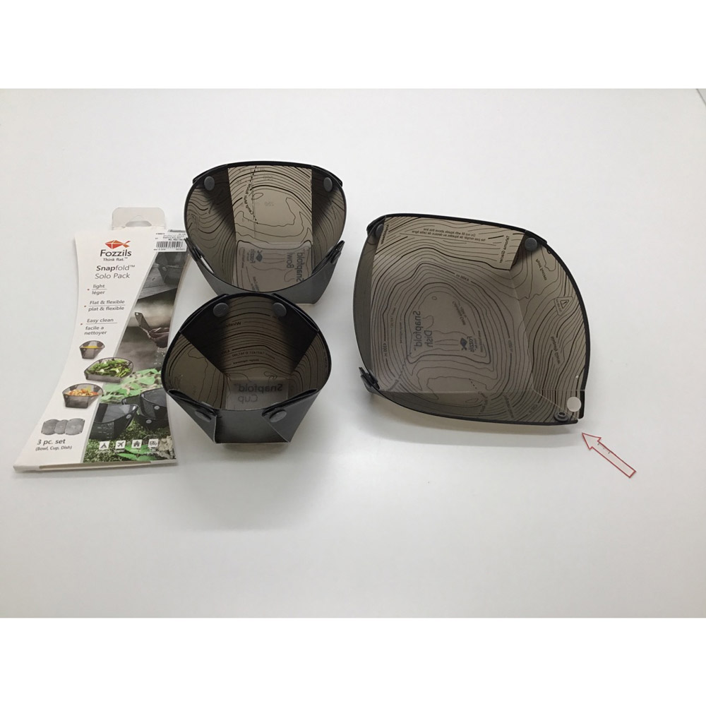 折りたたみ食器(カップ、ディッシュ、ボウルの3点セット)です。簡単に組み立てられて、軽量、しかもフラットになり持ち運びや収納に便利。
