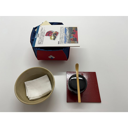 【構成】茶せん、茶杓、茶碗、茶巾、盆2枚、棗(なつめ)