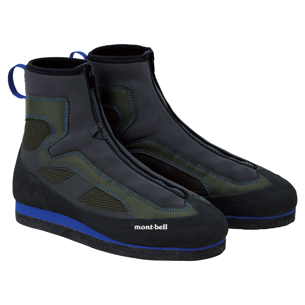 アウトソールには、コケやぬめりに強いポリプロピレン製フェルトを使用しています。靴ひもは締めやすいコードロック仕様のモデルです。足首のスパッツと一体化したレースカバーにより、余ったコードのひっかかりや損傷を軽減します。