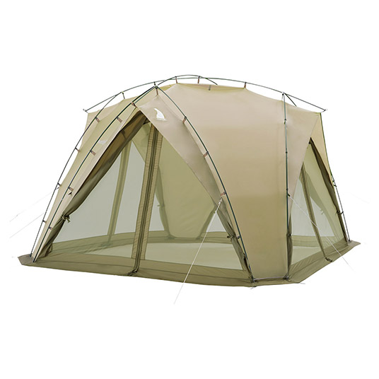 すべての面が生地とメッシュ地の二層になっているので、メッシュ地だけの状態にして蚊帳のようにしたり、4方向を全開にして開放感のある大型タープとして使用することができます。室内から開閉できる独自のベンチレーションシステムにより、雨天時や夏場でも快適に過ごしていただけます。