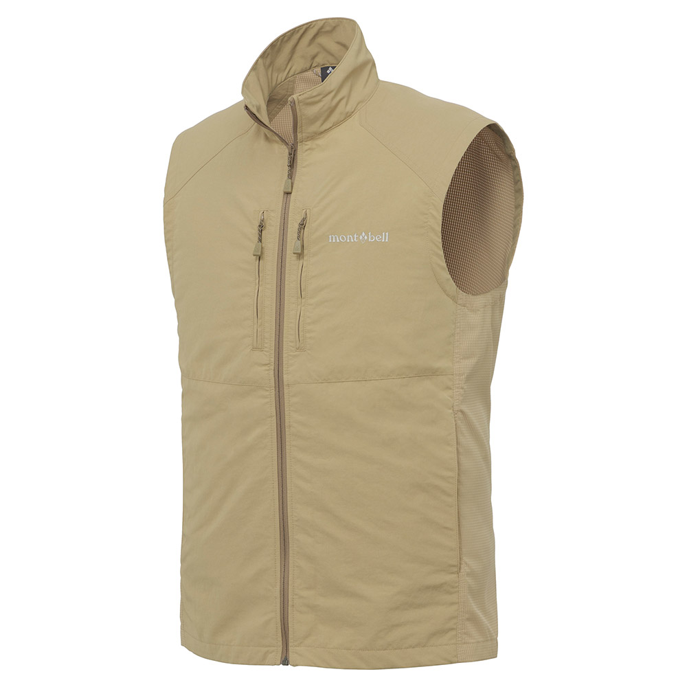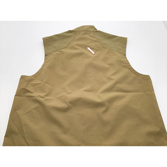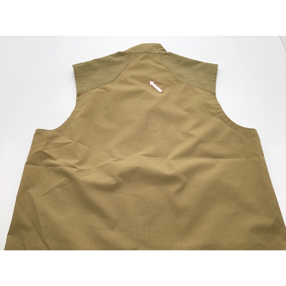 すっきりとしたシルエットのベストです。前面は両胸と両腰の4カ所にポケットを配置。表地は防風性とはっ水性を備えたコットンのような薄手のナイロン地を使用しています。背面から側面にかけて通気性に優れたメッシュ素材を使用することで、蒸れにくく快適な着心地を保ちます。