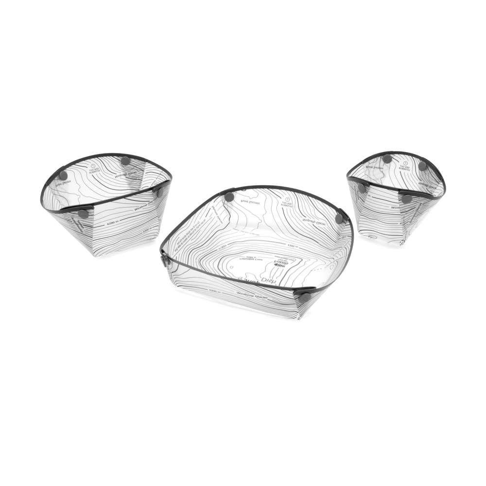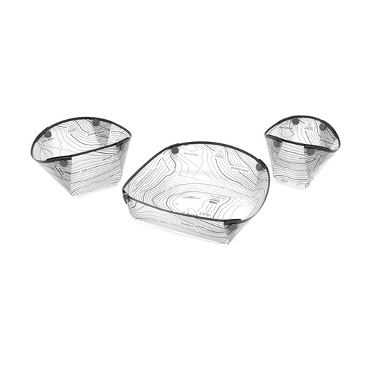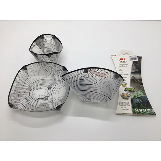 折りたたみ食器(カップ、ディッシュ、ボウルの3点セット)です。簡単に組み立てられて、軽量、しかもフラットになり持ち運びや収納に便利。