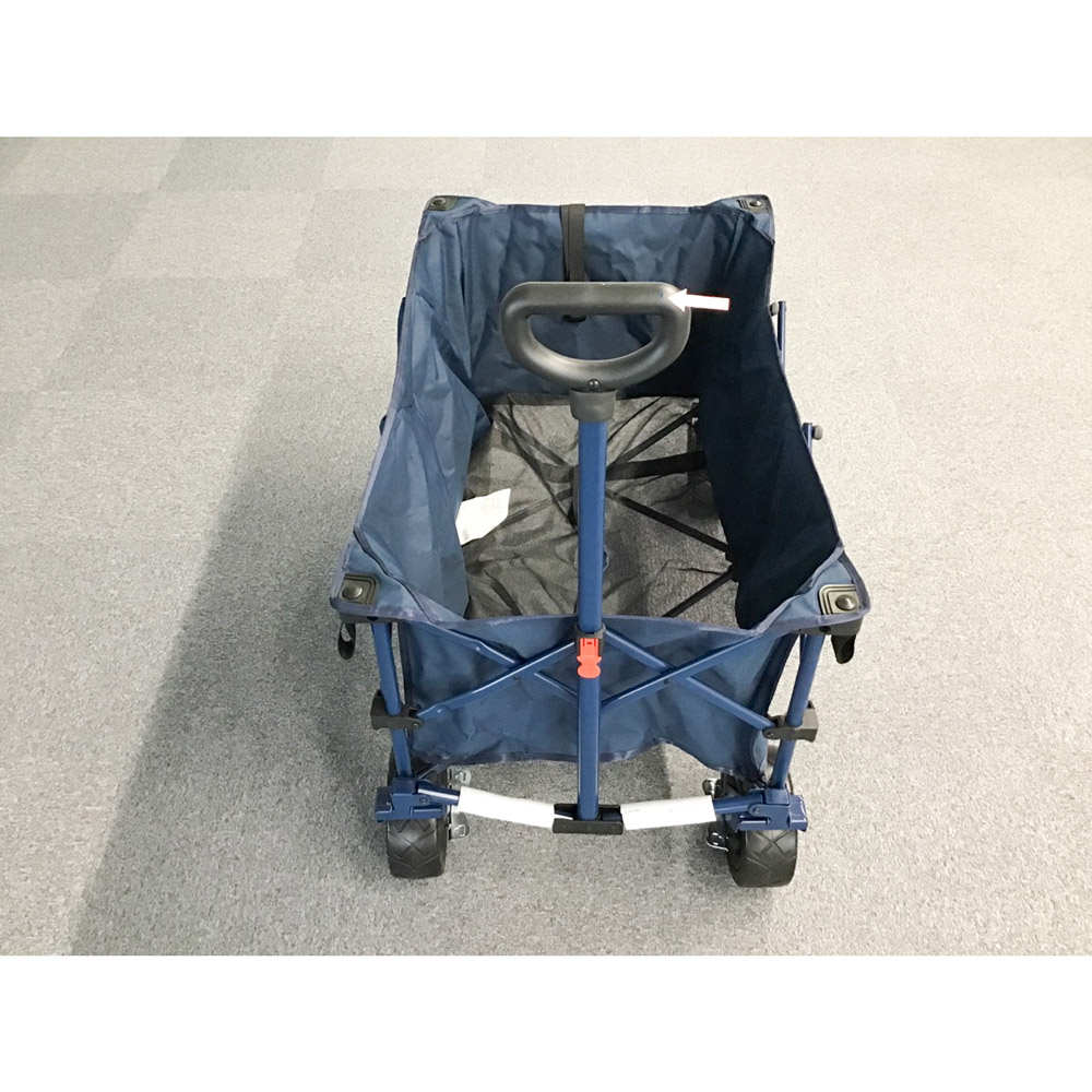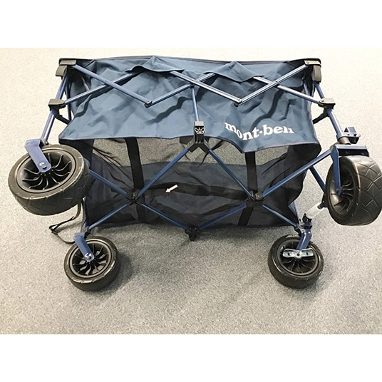 キャンプをはじめさまざまなアクティビティで道具の運搬に便利な大容量のワゴンです。大径で幅広のタイヤは安定感に優れ、タイヤロック機能も備えています。底面にはメッシュ素材を使用し、濡れたものを運んでも乾きやすくなっています。底面の取っ手を引くだけでコンパクトに収納でき、収納した状態でもハンドルを出して移動することが可能です。スチール製の頑丈なフレーム構造で100kgまで運搬可能。収納カバー付き。