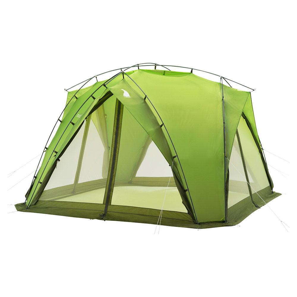 すべての面が生地とメッシュ地の二層になっているので、メッシュ地だけの状態にして蚊帳のようにしたり、4方向を全開にして開放感のある大型タープとして使用することができます。室内から開閉できる独自のベンチレーションシステムにより、雨天時や夏場でも快適に過ごしていただけます。