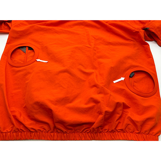 【特長】ジッパーがあごに当たらない仕様 / ファン、バッテリーをまとめて収納できるキャリングバッグ付き / 全体に空気を循環させる左右非対称なファン取付穴(穴径90mm) / デタッチャブルフード / バッテリー収納ポケット / 襟内側にコールドパック用ポケット